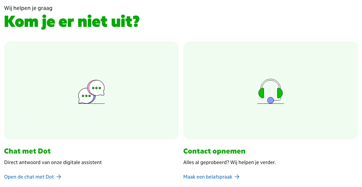 Die ingewikkelde link toont ergens rechtsonder buiten beeld dus “Maak een belafspraak”. (Als je tenminste niet eerst ergens anders klikt op die pagina, wat toch érg voor de hand ligt... 🤯)