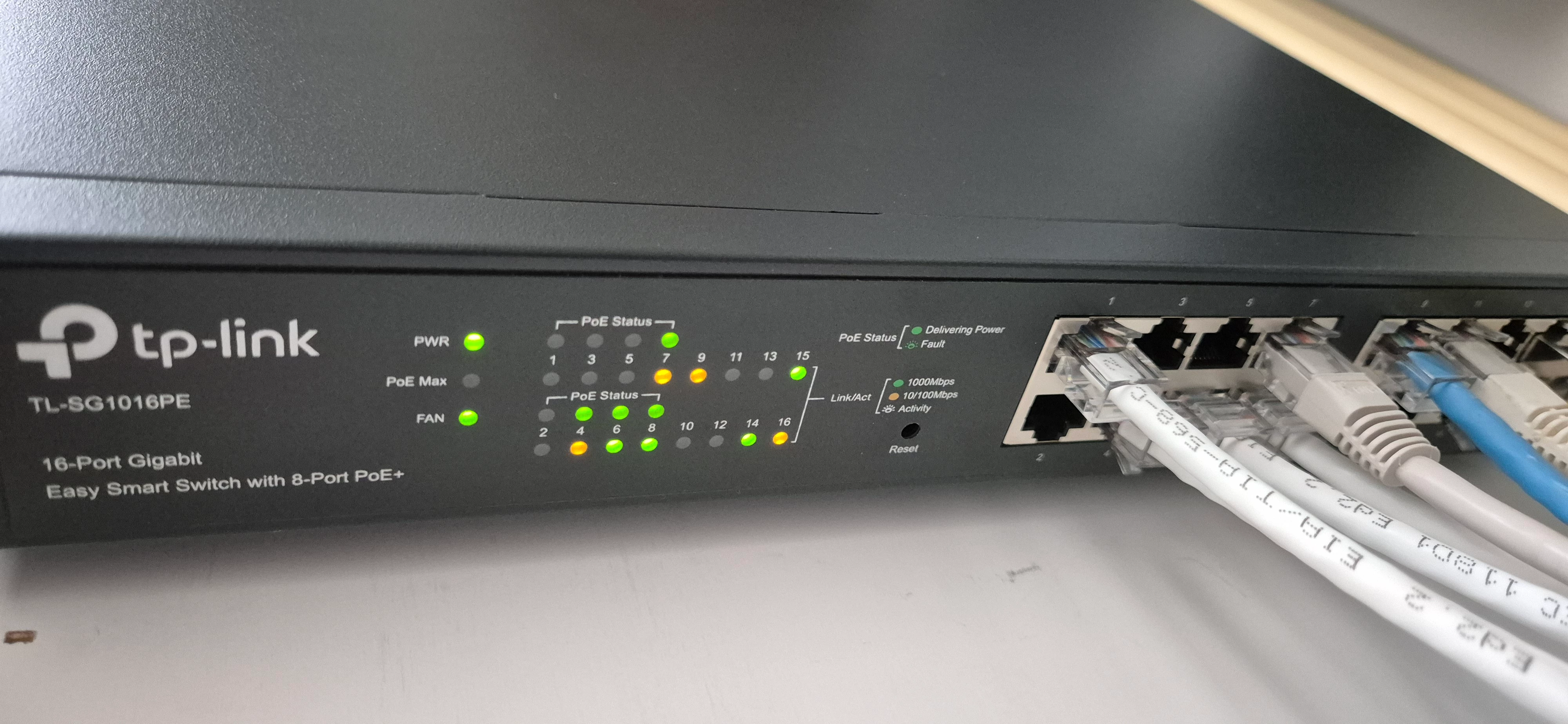 De lampjes branden ook bij de aangesloten kabels en laten dataverkeer zien afhankelijk van snelheid verbinding.