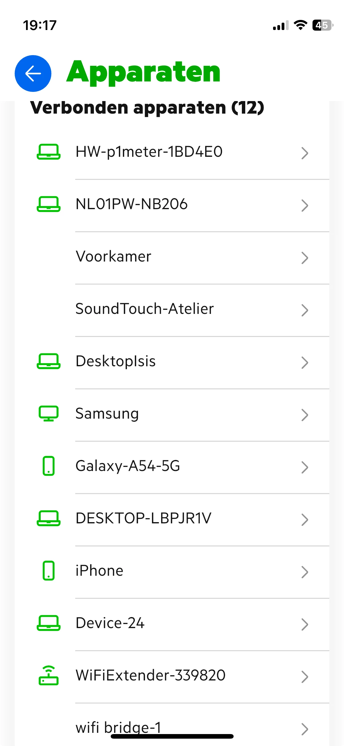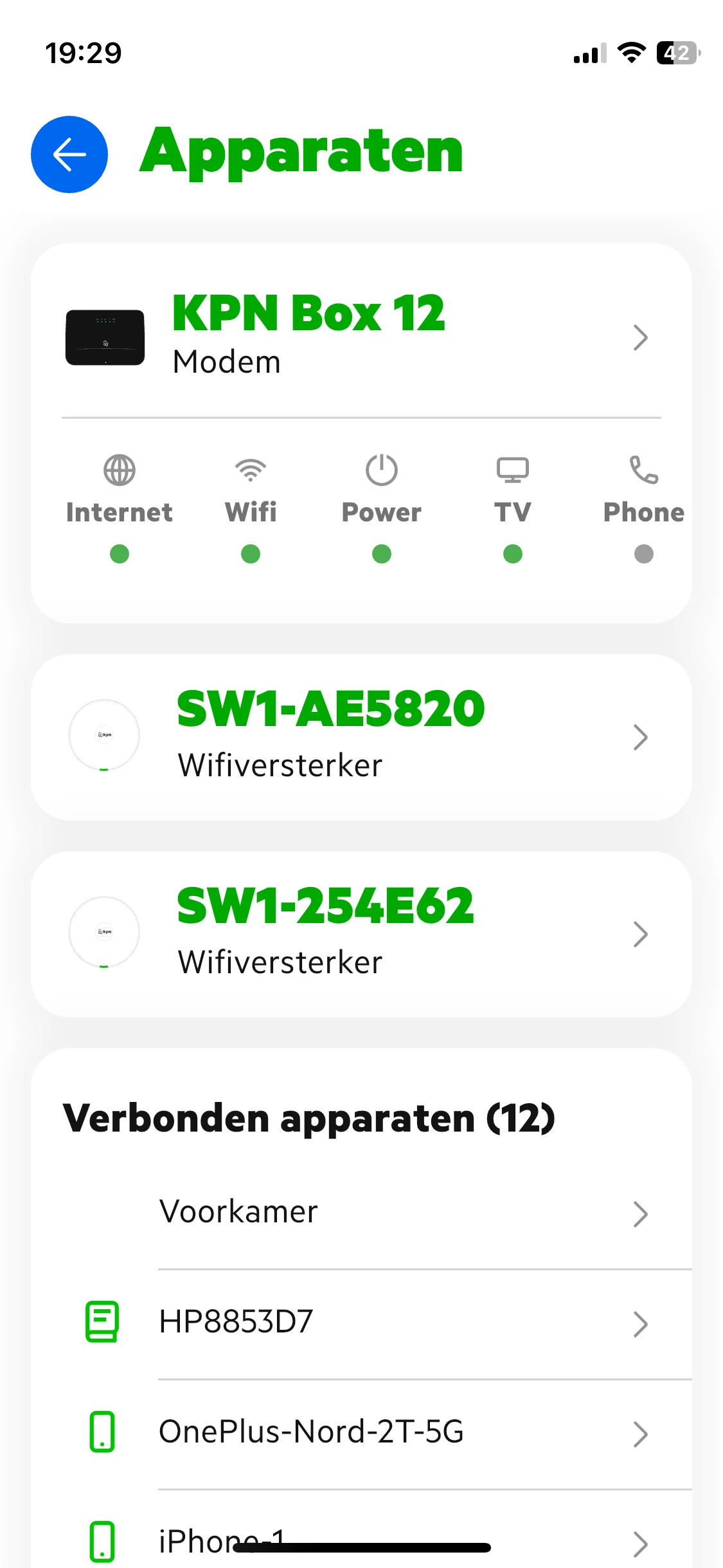 overigens staat wifi versterker 1, die bedraad gekoppeld is hierboven als een gekoppeld apparaat (wifiExtender-339820). En versterker 2 en 3 staan als los apparaat in mijn netwerk overzicht in de kpn app (SW1-AE5820 en SW1254E62)