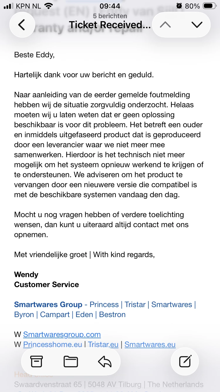 Naar aanleiding van de eerder gemelde foutmelding hebben wij de situatie zorgvuldig onderzocht. Helaas moeten wij u laten weten dat er geen oplossing beschikbaar is voor dit probleem. Het betreft een ouder en inmiddels uitgefaseerd product dat is geproduceerd door een leverancier waar we niet meer mee samenwerken. Hierdoor is het technisch niet meer mogelijk om het systeem opnieuw werkend te krijgen of te ondersteunen. We adviseren om het product te vervangen door een nieuwere versie die compatibel is met de beschikbare systemen vandaag den dag.