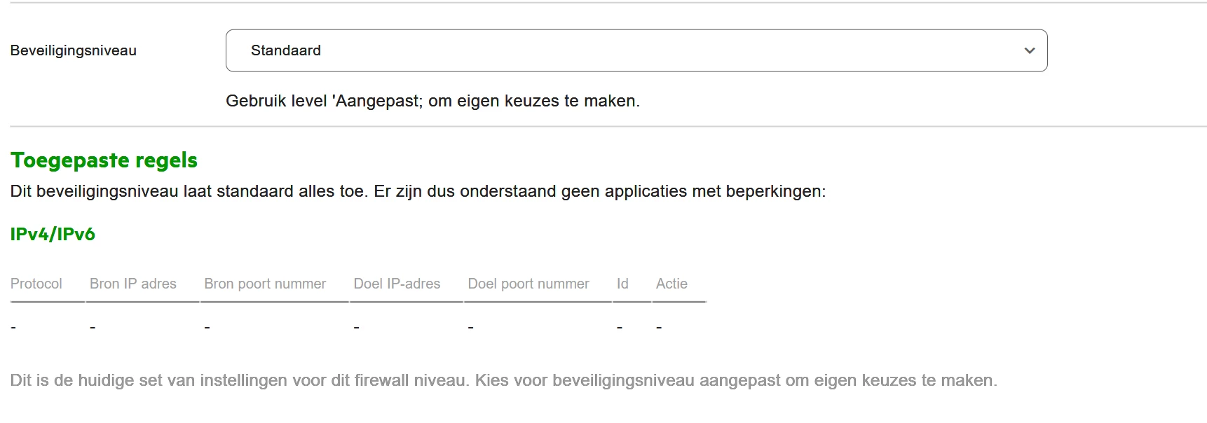 Ok. Ga naar de firewall en zet deze op Standaard.