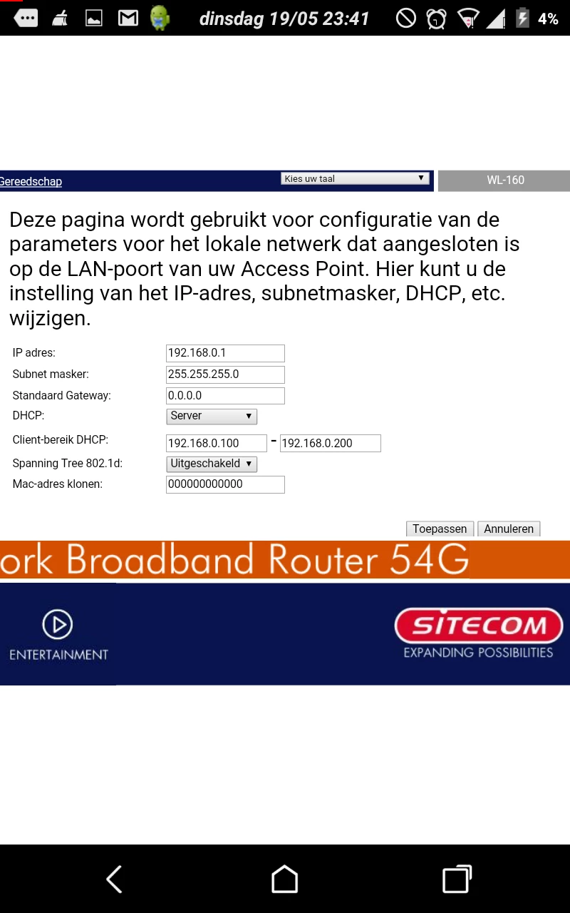 DHCP op de sitecom staat aan (mijn telefoon krijgt ip-adres 192.168.0.100 van de WL-160 router van Sitecom).