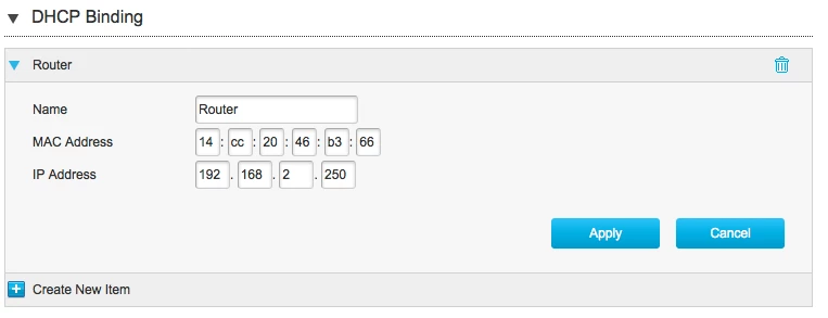 Gebruik dat MAC adres (14🇨🇨24:46:b3:67) in die DHCP binding voor IP adres 192.168.2.250 en start jouw eigen router daarna opnieuw op.