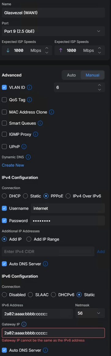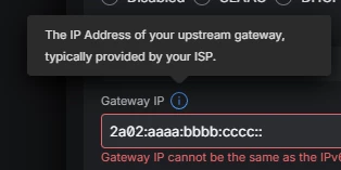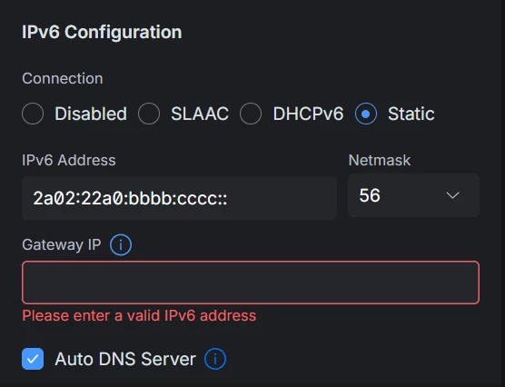 Als ik in Unifi de IPv6 Configuration op “Static” zet en het bovenstaande invul krijg ik de volgende foutmelding: