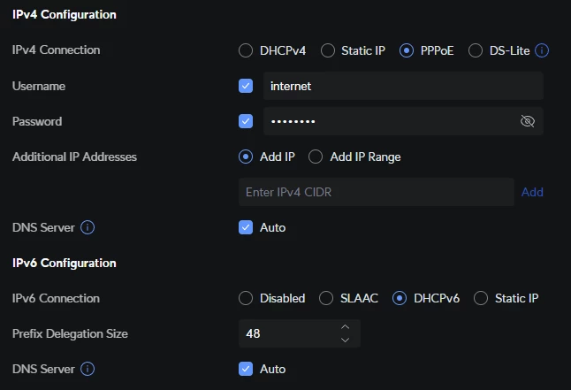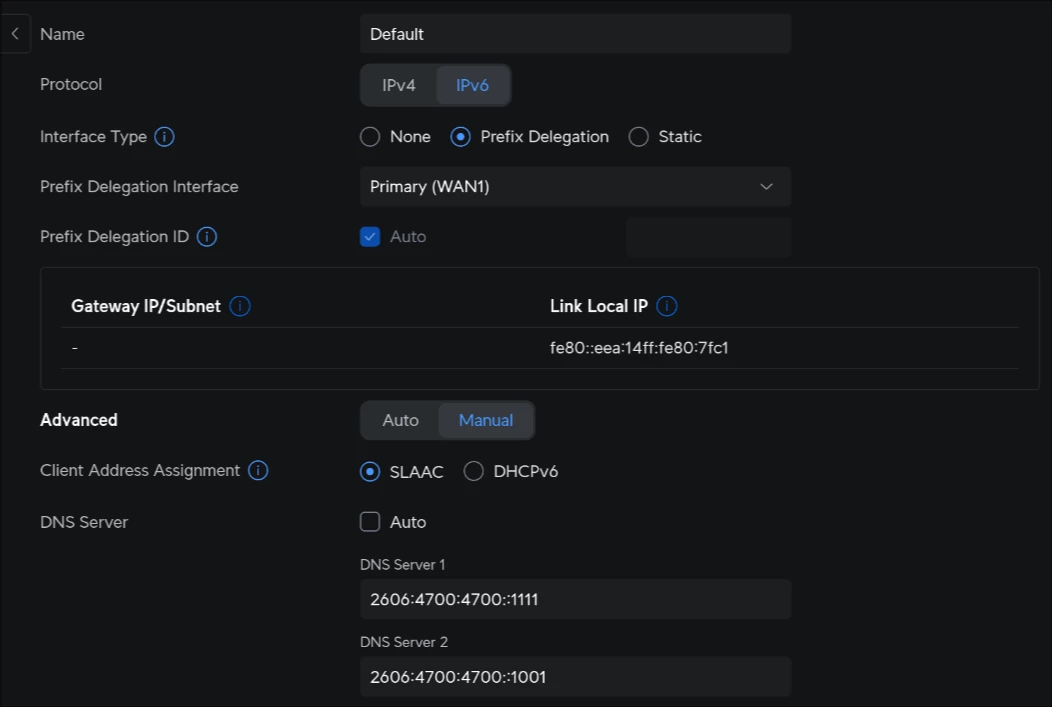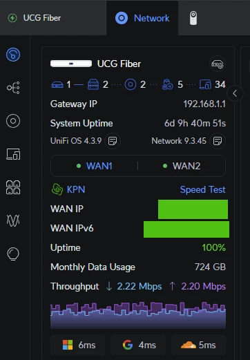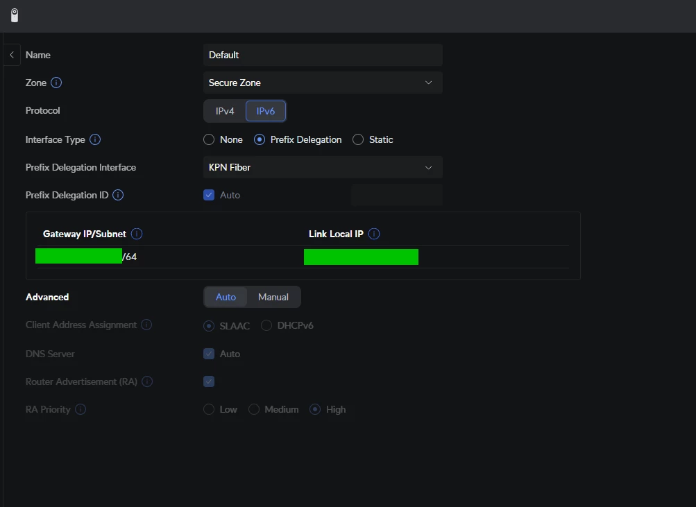 Nu werkt alleen de connectiviteit nog niet (geen antwoord van de gateway bijvoorbeeld). Dus nog even verder kijken waar het mogelijk aan ligt. Apart genoeg zie ik als ik SSH naar mijn UDM-Pro nergens mijn WAN IPv6 adres staan (via `ip -6 a`) ookal staat dit in de UI wel ingesteld. Ook als ik SSH ping naar het IP van de UDM-Pro zelf komt er geen antwoord.
