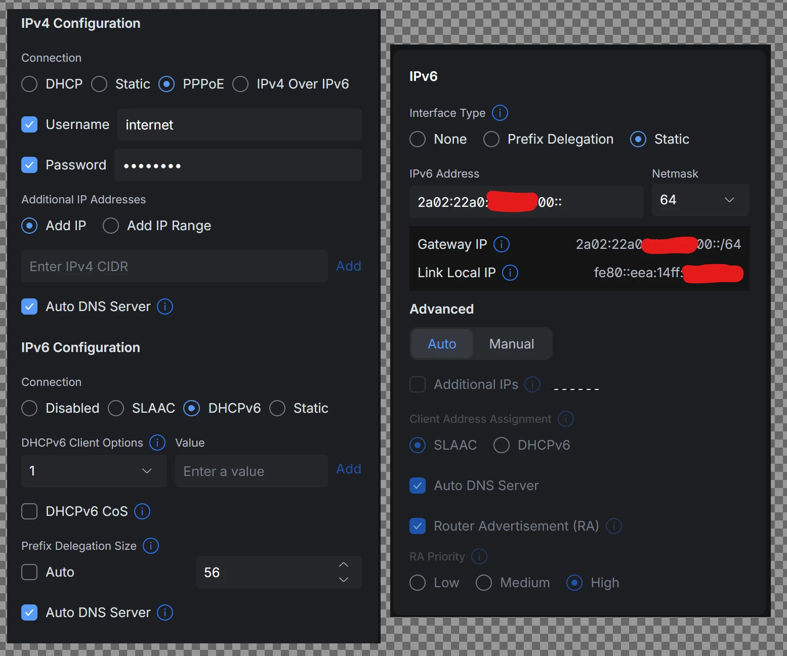Dan moet je dus weten hoe je die prefix krijgt: statisch, of moet je die opvragen via DHCPv6. Als je de prefix moet aanvragen krijg je geen verbinding zolang DHCPv6 niet functioneert.  En hoe zit het met VLAN en PPPoE?