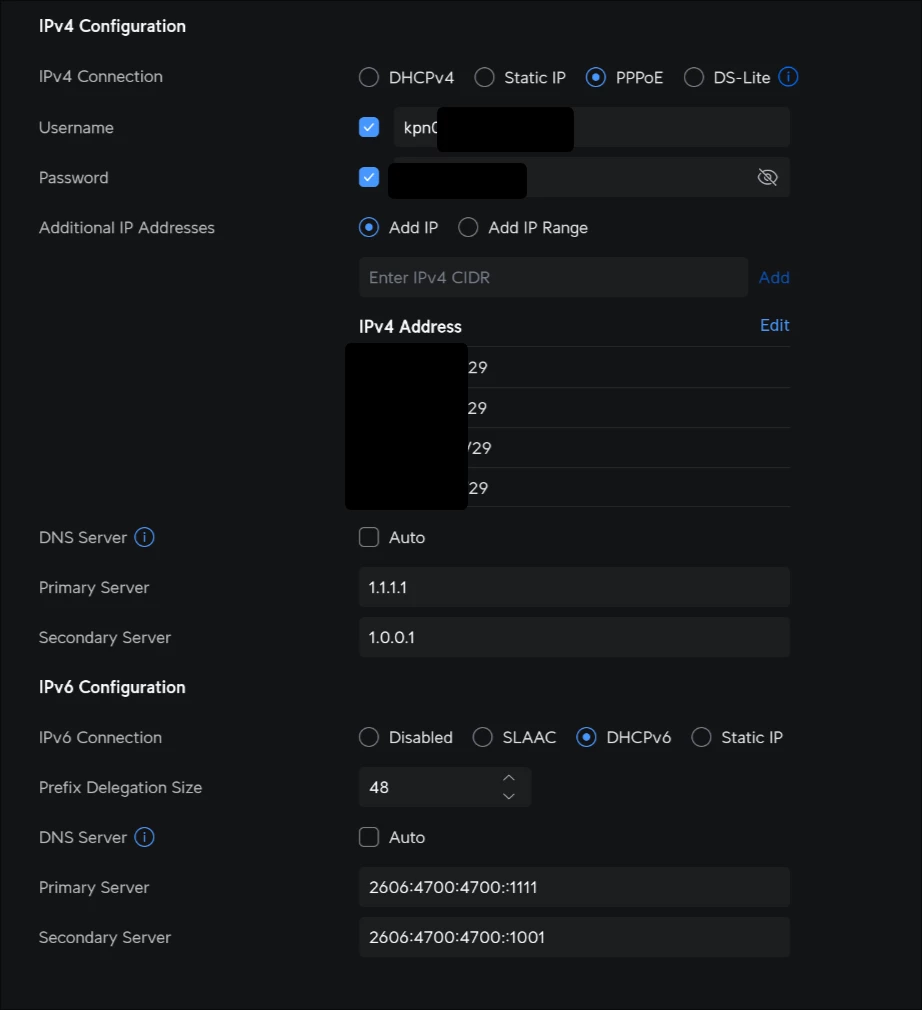 IPv6 was nog niet ingeschakeld en dus ook nog geen subnet toegewezen. Dit is nu ingeschakeld en toegewezen. Ik heb op UniFi op de WAN alles ingesteld zoals de klantenservice mij heeft doorgemaild (statisch IP, /56 mask, default gateway.).