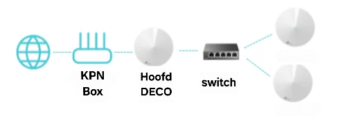 KPN Modem ↔ Hoofd-Deco ← Deco Wifi →  Slave-Deco ↔  TV Box
