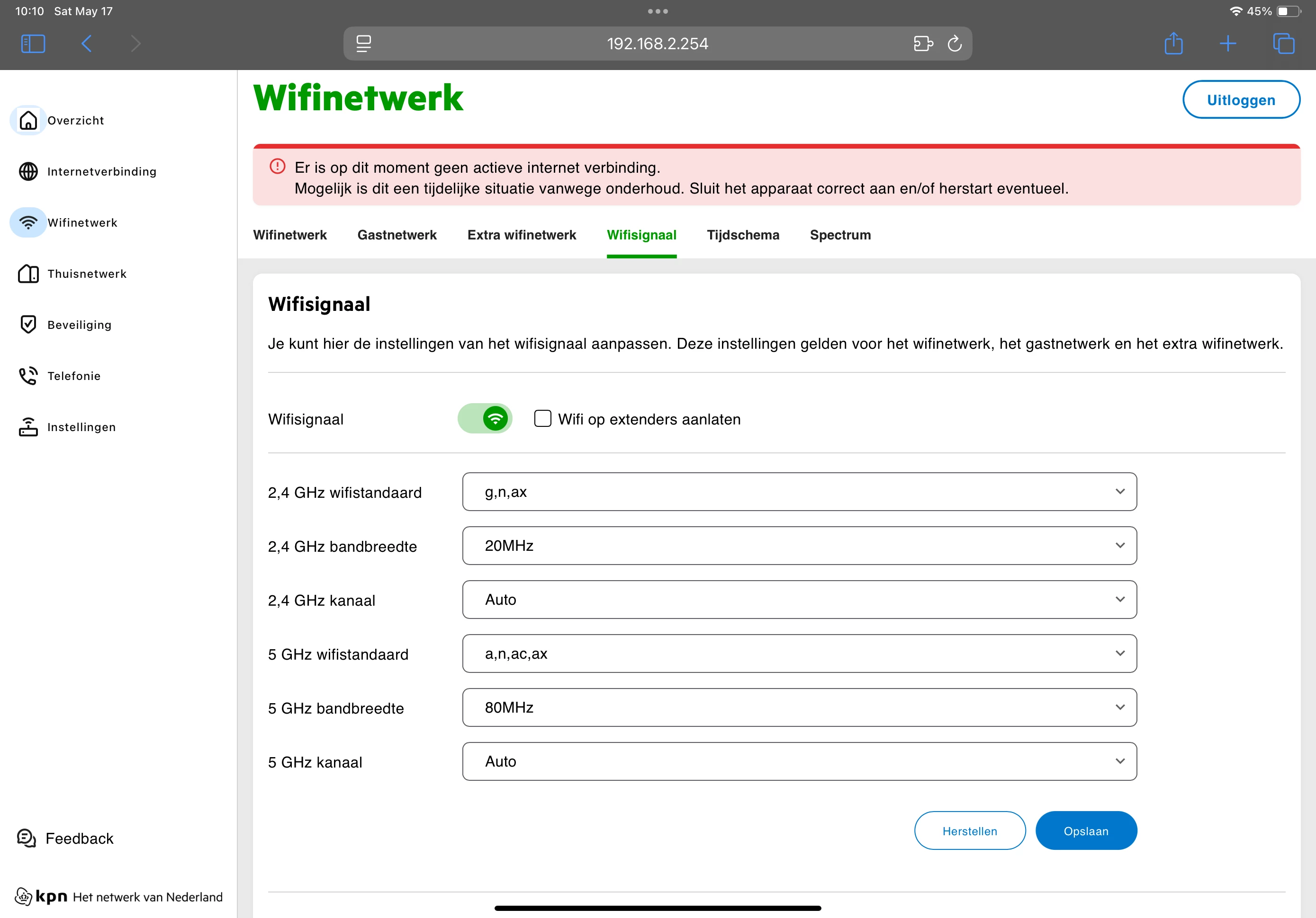 Het wifi signaal 2,4 en 5 ghz is gewijzigd van 20 naar 40 en van 80 naar 160 mhz. Kan hem ook niet meer terugzetten naar oude instellingen.