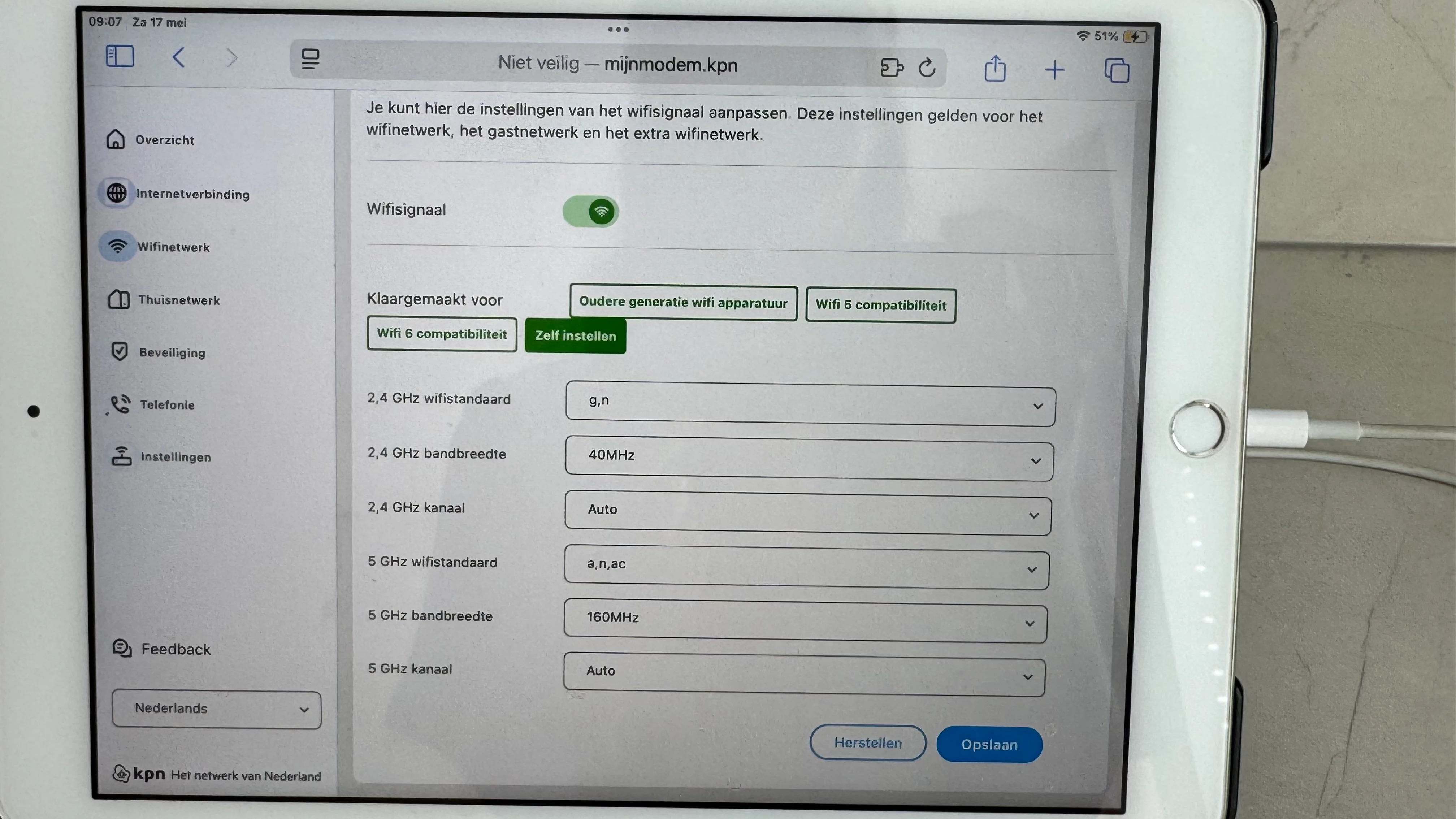 Kan je de 2,4 GHz WiFi standaard naar b,g,n zetten?