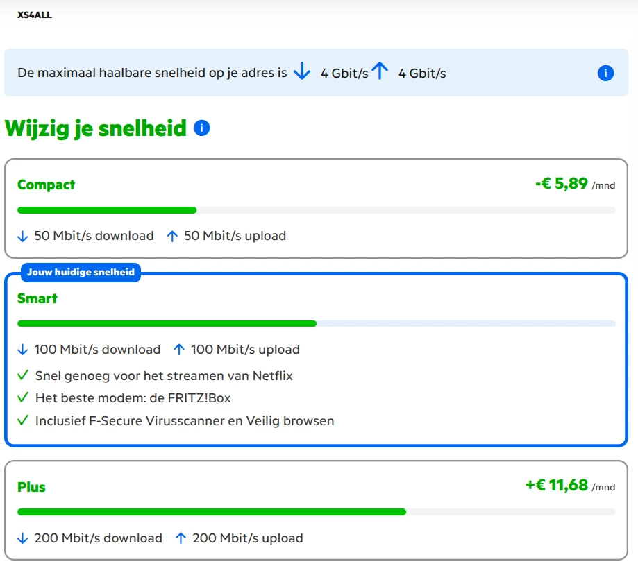 Dan moet u ook maar even terug lezen ​@Marlon92 . Ik heb, anders dan ​@Harry_Berg, niet aan gegeven 4 GB te willen, heb aan 100/100 /MB in principe genoeg. Ik bevestig alleen dat je met een XS4ALL abonnement de hoofdprijs betaald. Zie onder de 3 print screens.