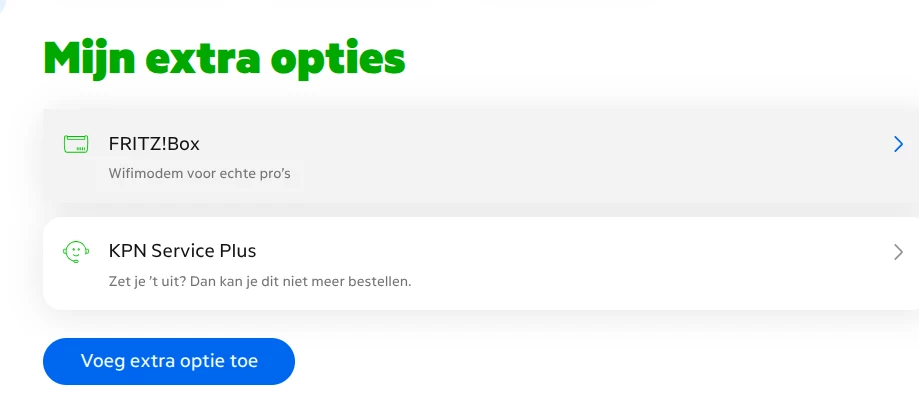 Wat ik met star bedoel is dat ik Spotify niet uit kan zetten tegen een lager maandbedrag, binnen de KPN abonnementen kan dat wel. Ik kan Service Plus ‘uit’ zetten maar dat resulteert niet in een lager maandbedrag, terwijl deze service wel voor een x bedrag onderdeel is van het abonnement. De Fritz!box is onderdeel van ‘Mijn extra opties’. De box teruggeven en een eigen router gebruiken resulteert niet in een lager maandbedrag terwijl KPN hier normaal €7,49 aan huur voor in rekening brengt.
