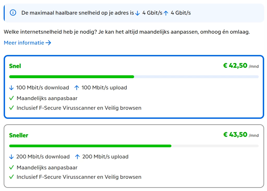 Voor een verhoging naar 200 mbit moet nog even 9 euro extra afgetikt worden. Terwijl er bij nieuwe abonnementen maar 1 euro tussen 100 en 200 mbit zit.