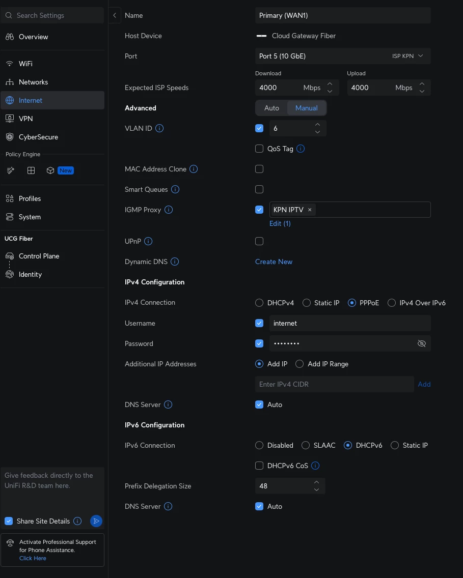 Ik heb sinds vandaag een 4 gigabit KPN glasvezel abonnement. Voordat dit actief werd heb ik me op deze community ingelezen op de mogelijkheden om dit goed in te stellen op mijn Unifi netwerk met de Cloud Gateway Fiber met de Netwerk 9.4.19 UI, zonder gebruik te maken van het KPN Modem.