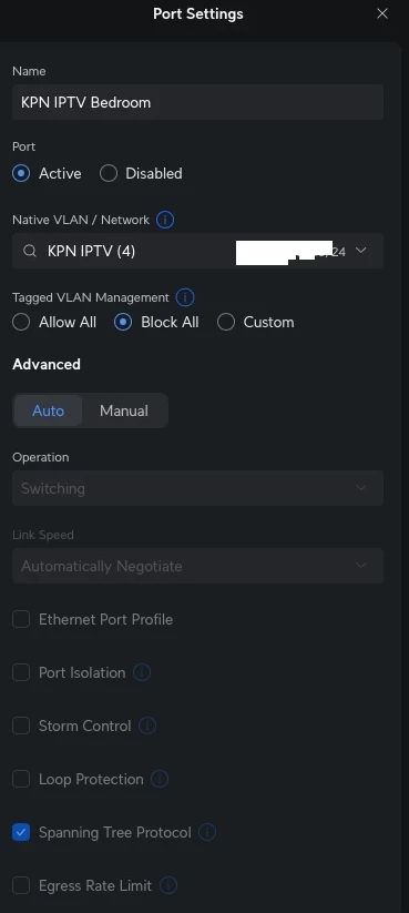 4. Op de twee Flex switches heb ik de poorten die naar de KPN TV+ Box gaan ingesteld met dit poort profiel. Volgens ChatGPT en Gemini, zou dit moeten werken. Maar de KPN box krijgt geen ethernet connectivity en stelt voor dat ik wifi instel.