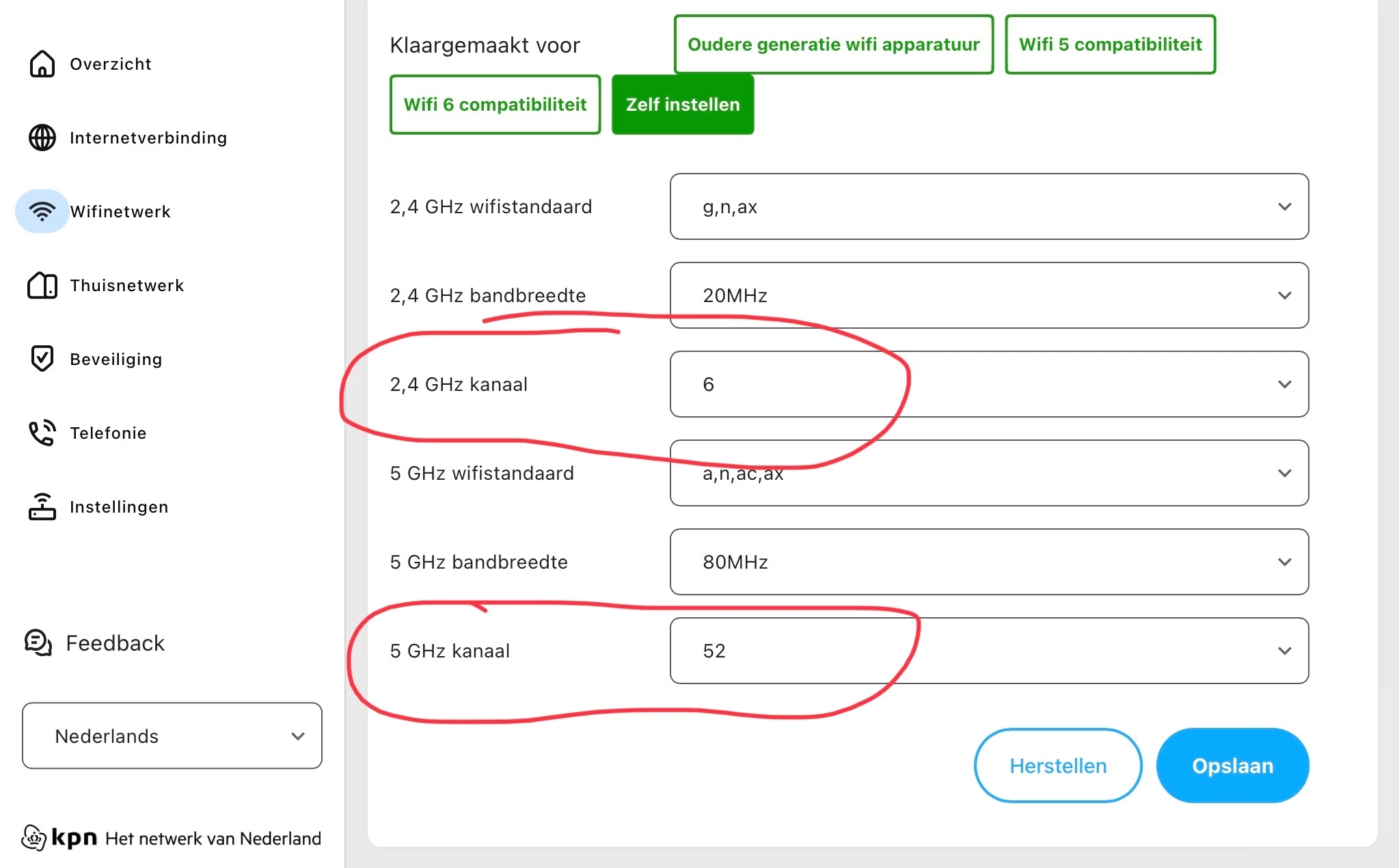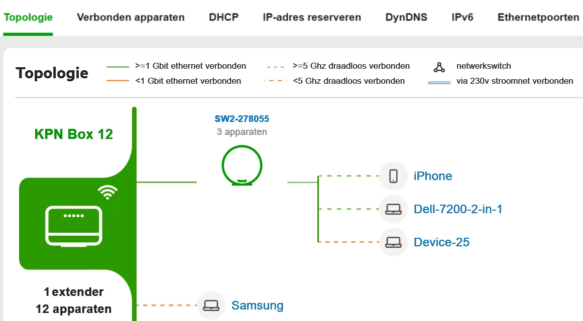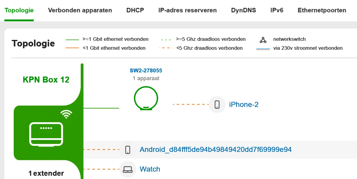 Ik zie dat alle apparaten verbonden zijn met 2,4 GHz (rode stippellijn), daar gaat al iets mis.
