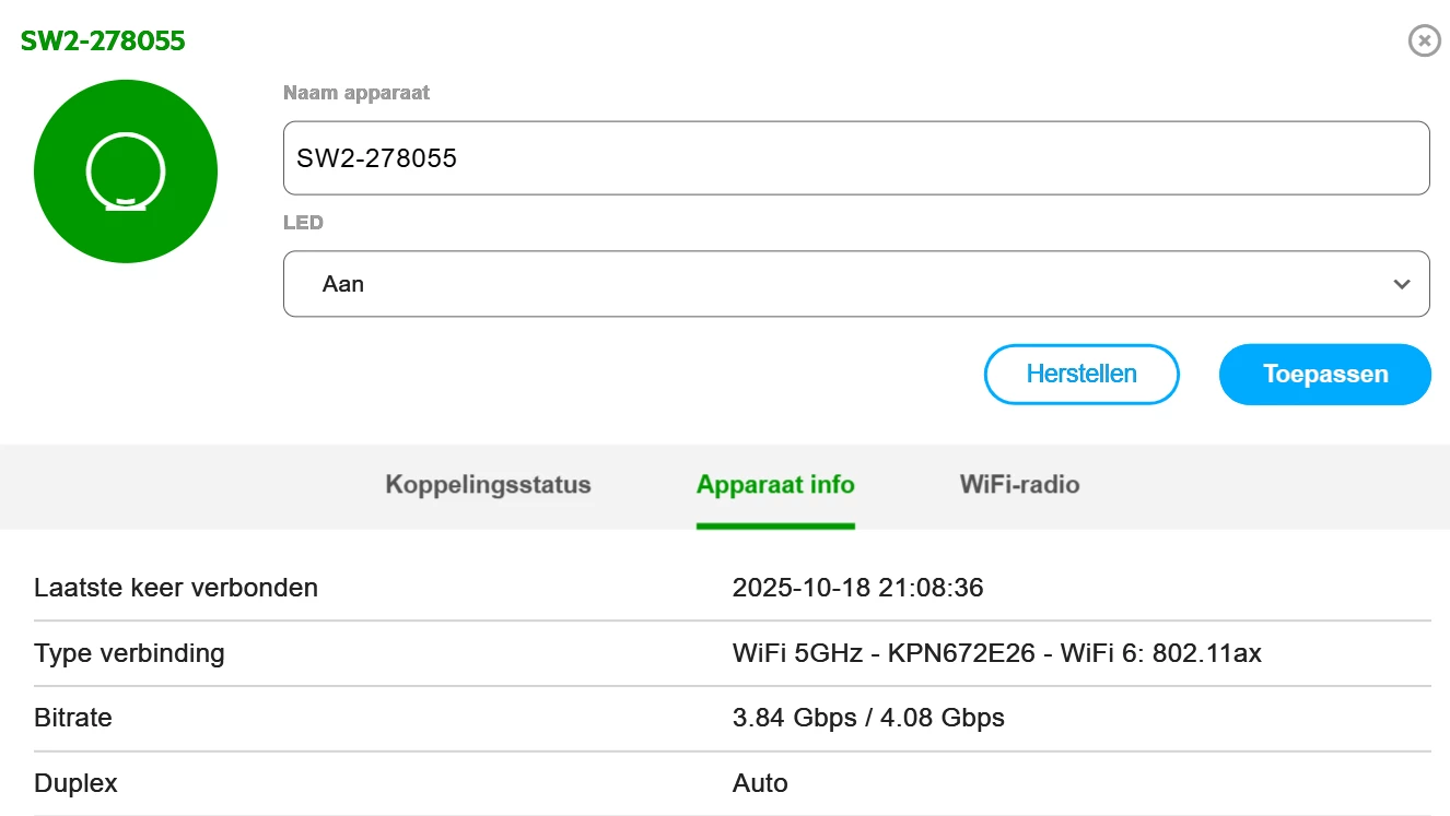 Helaas al mijn smart home apparaten opnieuw verbinding moeten laten maken met de standaard SSID. Ik gebruik een eigen SSID i.v.m. periodieke overstap naar andere internetproviders. In totaal 16 apparaten verbonden met het “nieuwe” netwerk en patsboem internet op de 1e verdieping weer matig.