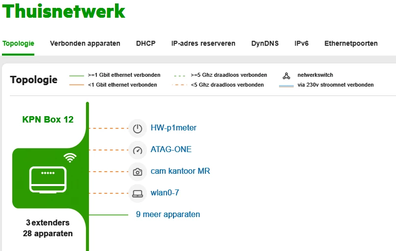 Ik heb wat problemen met wifi-verbindingen dus ben ik eens in mijn KPN box 12 en in de MijnKPN app gaan kijken maar ik kan nergens meer de apparaten vinden die aan de Superwifi's hangen. Er hangen 2 bedrade en 1 draadloze Superwifi2 aan mijnĀ  KPN box. Ik zie alleen alles wat rechtstreeks verbonden is met de Wifi van de KPN box. In de app op de mobiel krijg ik een leeg scherm bij verbonden apparaten In de box zelf krijg ik NIKS als ik klik op "9 meer apparatenā€. Ik kan in "Topologieā€ ook niet naar de Superwifi's. Ik heb ca. 70 leases die ik alleen zie als ik op DHCP klik, maar kan niet zien hoe ze verbonden zijn.