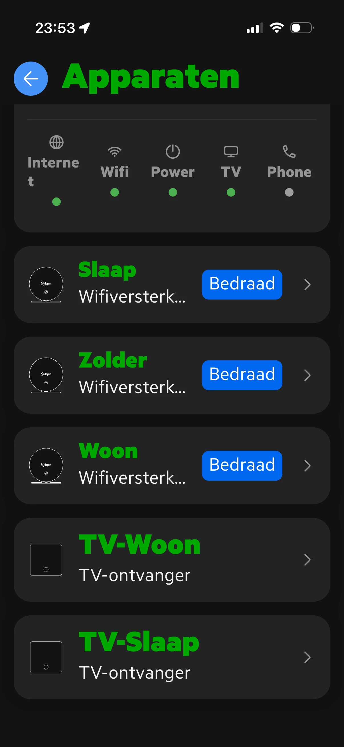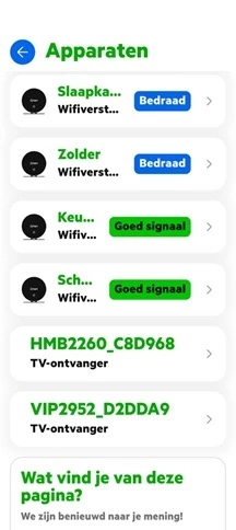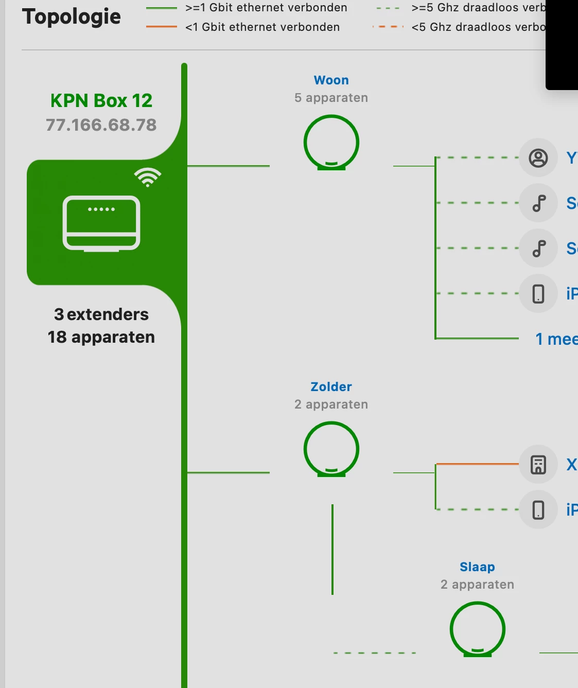 Blijf het apart vinden, ik kijk via mobiel naar mijn v12 modem en zie daar de toplogie anders afgebeeld ,daarom ook maar eens in de mijnkpnapp gekeken wn wat schetst mijn verbazing nu wordt dus sw2 punten in de keuken en schuur wel als draadloos weergeven, terwijl ik er niks aan heb gedaan?