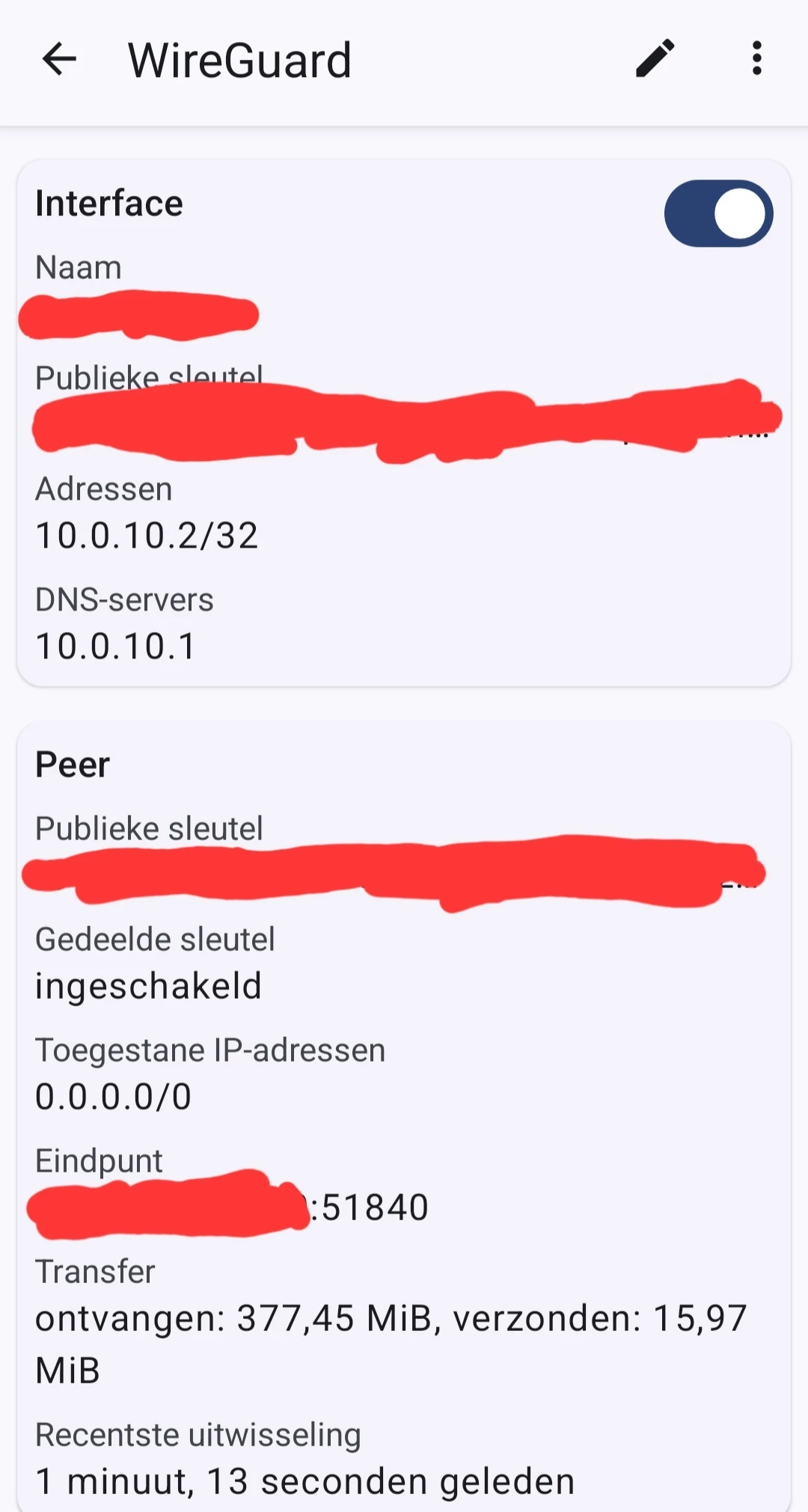 ping van telefoon naar 1.1.1.1. Communicatie tussen Wireguard peer (27139) en server(51820)