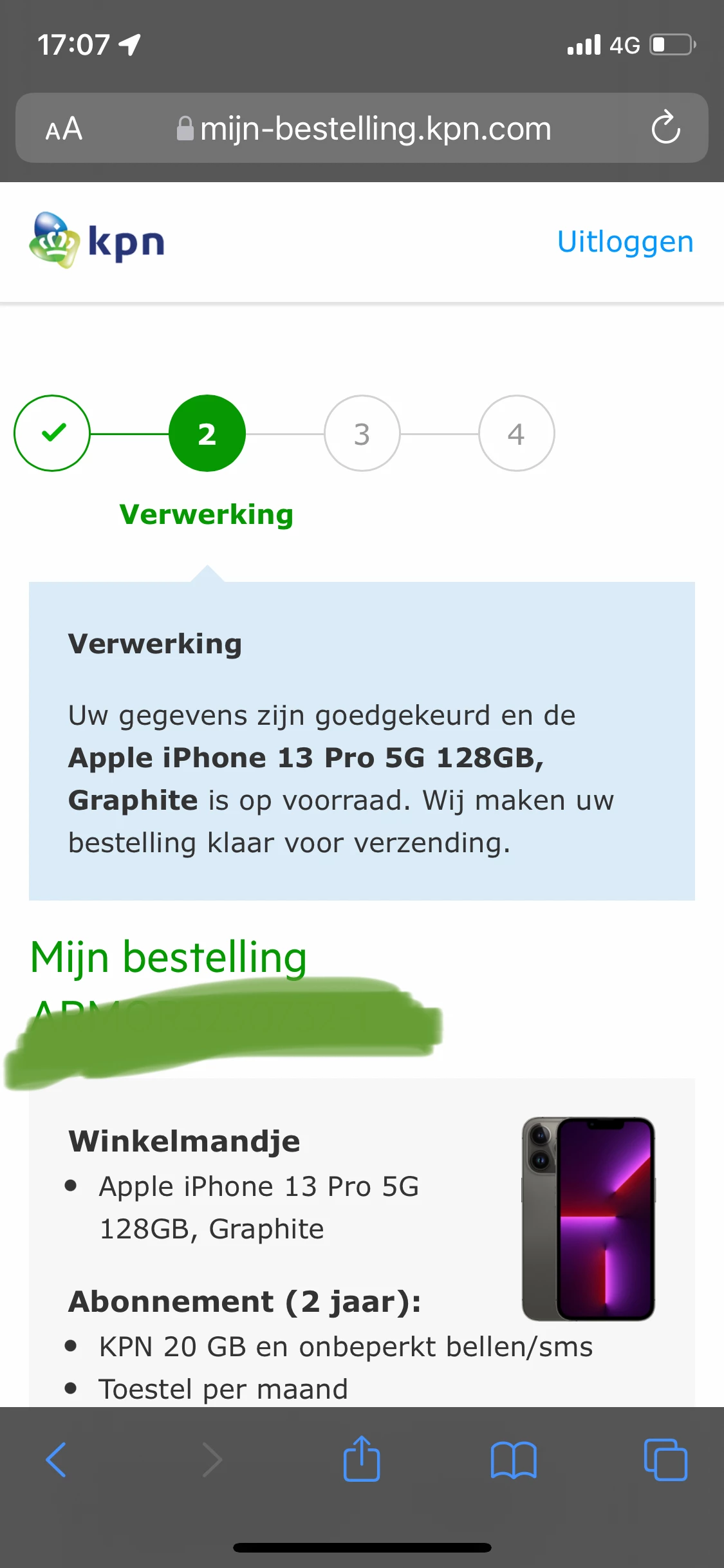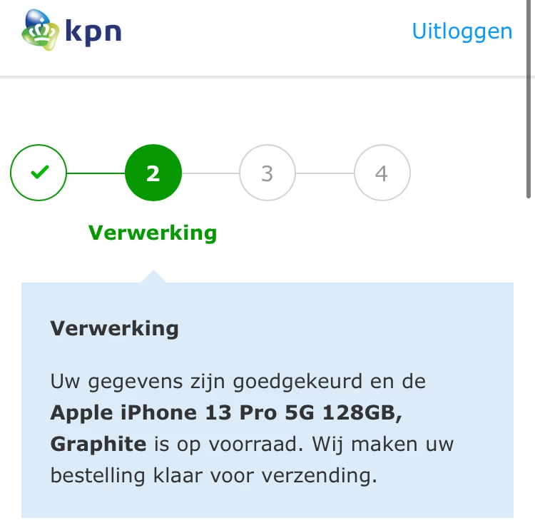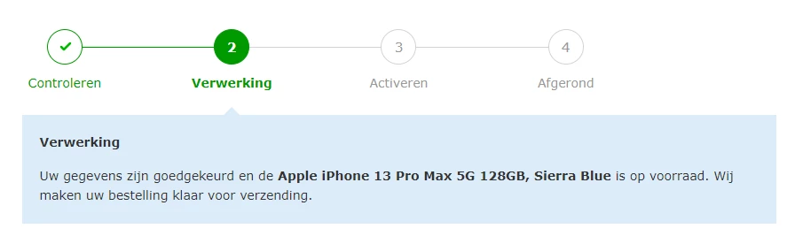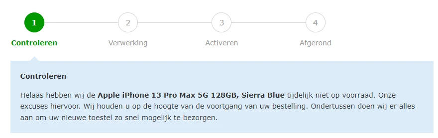 Op de bestelstatus pagina staat dat de telefoon helaas niet op voorraad is.