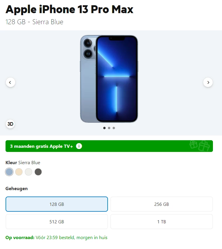 Bewust gekozen voor de 13 pro zonder acties. Apple TV boeit me niet. Vandaag gebeld met kpn omdat een code aanvragen per sms voor een aanbieding om abbo te verlengen al drie dagen niet werkt. Mij werd verzekerd door de vriendelijke dame van kpn dat de 13 pro op voorraad was en de levering alleen maar afhankelijk zou zijn van de snelheid van PostNL.