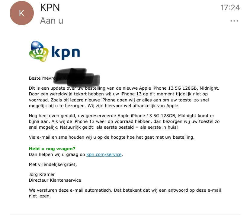 op 22 november j.l. Heb ik mijn abonnement verlengt met een telefoon namelijk de Apple iPhone 13 5G 128GB, Midnight. Nu is deze niet op voorraad en kreeg ik eerst bericht dat hij vanaf week 48 weer leverbaar zou zijn. Dit is inmiddels verschoven naar week 49-50 gedeeltelijk en vanaf week 51 weer leverbaar. Natuurlijk werken ze bij KPN met de regel “wie het eerst besteld heeft, word ook als eerste geleverd. Nu is mijn vraag hoe het dan mogelijk is dat de levering data met 3 weken kan verschuiven? Ook heb ik met de actie van korting op iPods mee gedaan en al betaald. Deze iPods ontvang is pas als mijn abonnement ingaat! Waarom moet ik dan al wel betalen???? Graag zie ik een persoonlijke reactie tegemoet van KPN met een eventuele oplossing zoals een andere kleur iPhone 13 of 1 met meer opslag voor dezelfde prijs want dit is niet de gang van zaken. Dan had KPN de bestelling moeten blokkeren en eerst hun voorraad op pijl moeten krijgen voor ze nieuwe bestellingen op kunnen nemen.