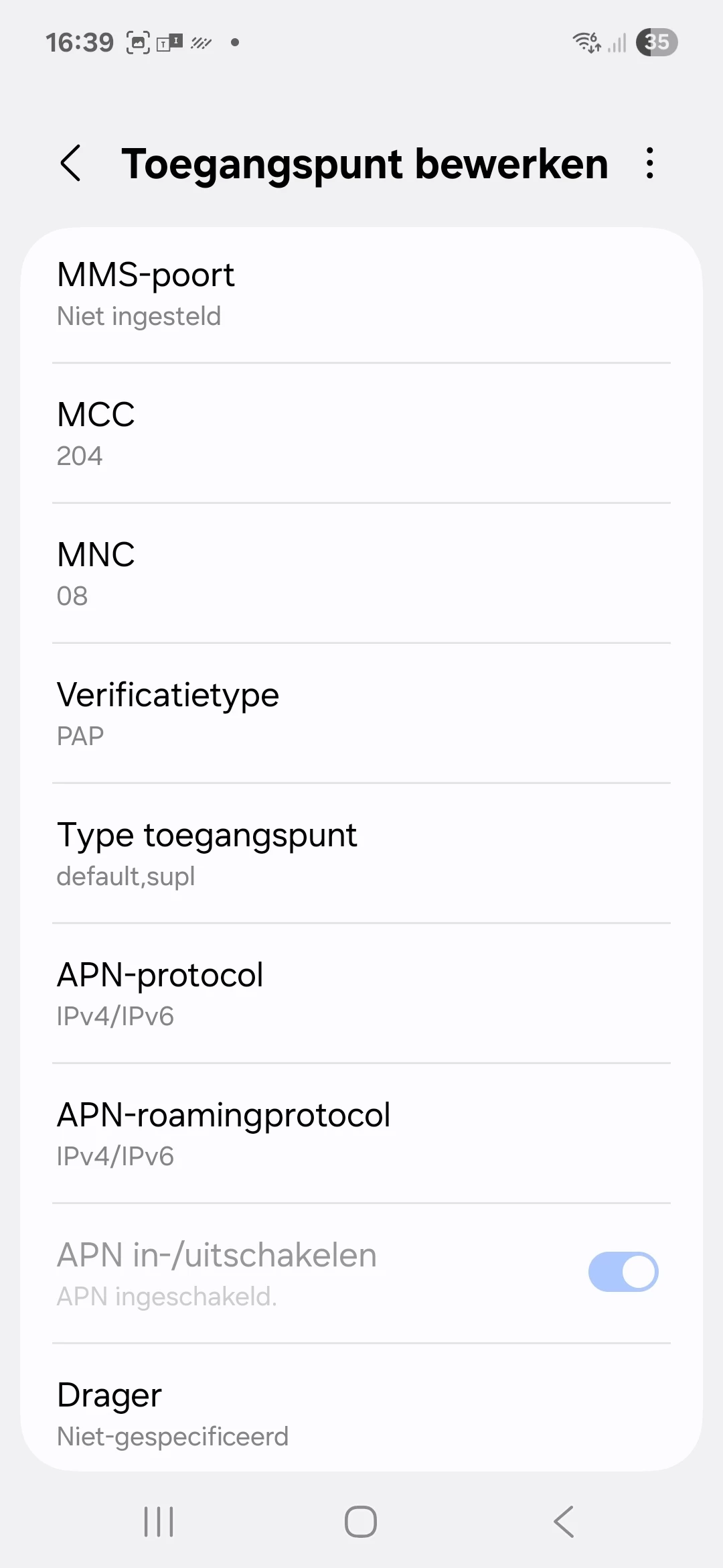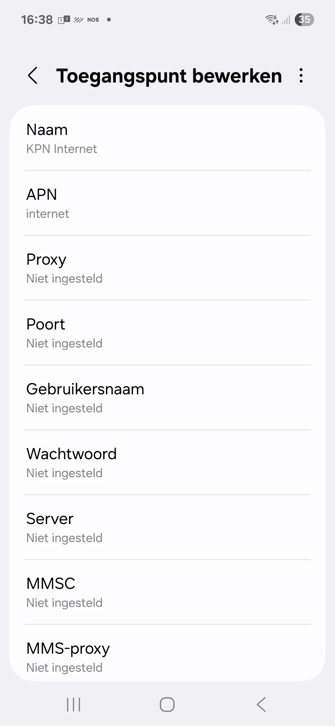 Als je zegt dat internet niet werkt dan moet je bij apn instellingen zijn. Wat mij opvalt is dat er MMSC/MMS instellingen zijn ingesteld. Deze zou ik verwijderen, leeg laten. MMS bestaat in Nederland al jaren niet meer. Dit zou het probleem kunnen zijn...