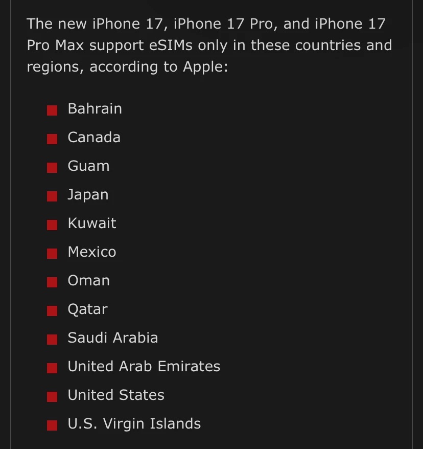 Dit is overigens niet een keuze van KPN, maar van Apple zelf. De eSIM only variant is alleen in deze landen beschikbaar: