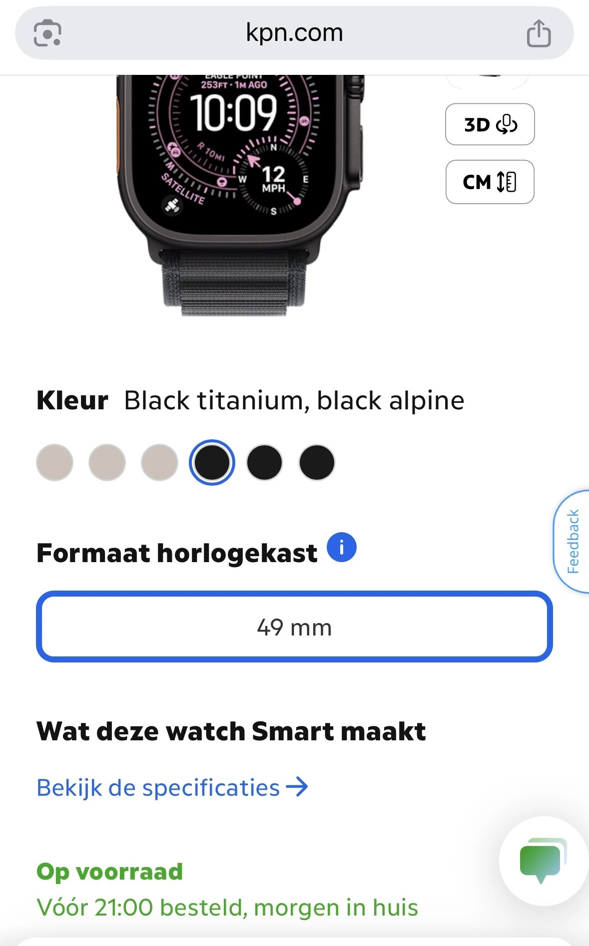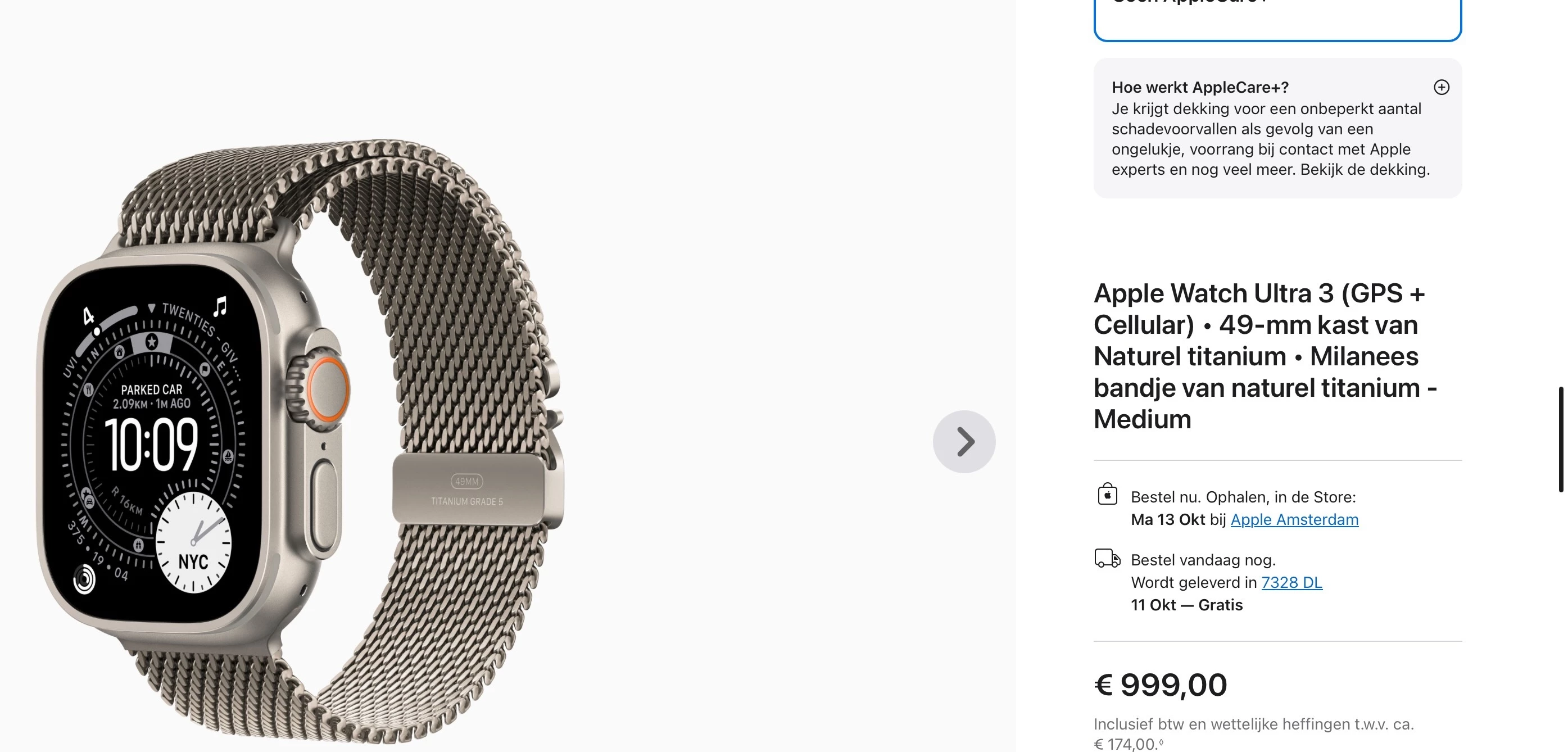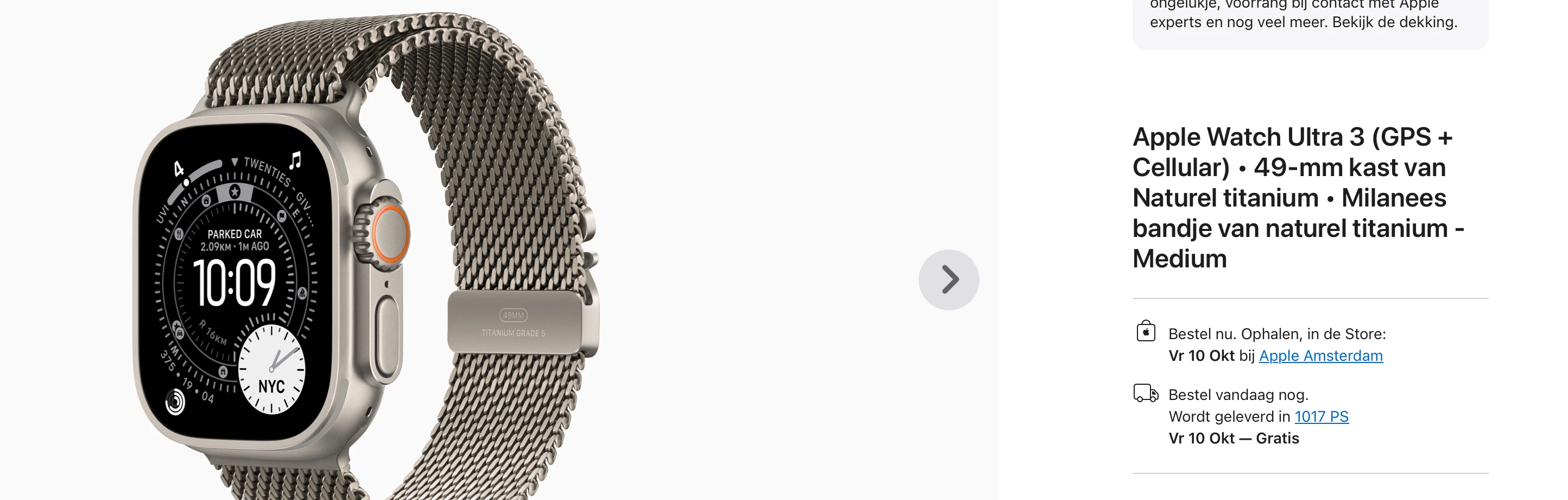 Apple Watch Ultra 3 bestaat in tientallen combinaties. Sommige combinaties (bijvoorbeeld met sportbandjes) hebben veel voorraad, andere (zoals het Milanees titanium bandje) zijn beperkter leverbaar.