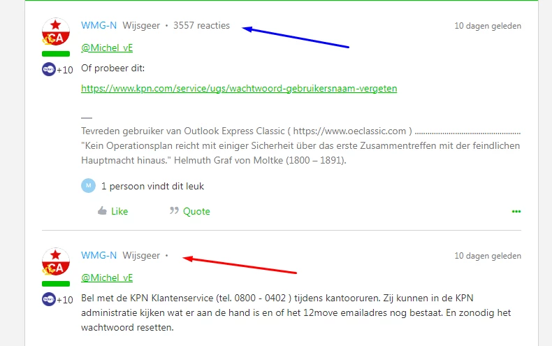 Dit is wat ik bedoel. bij de blauwe pijl staat het totaal aantal reacties van mij op dit KPN forum terwijl bij de rode pijl (in hetzelfde topic) dat aantal ontbreekt.