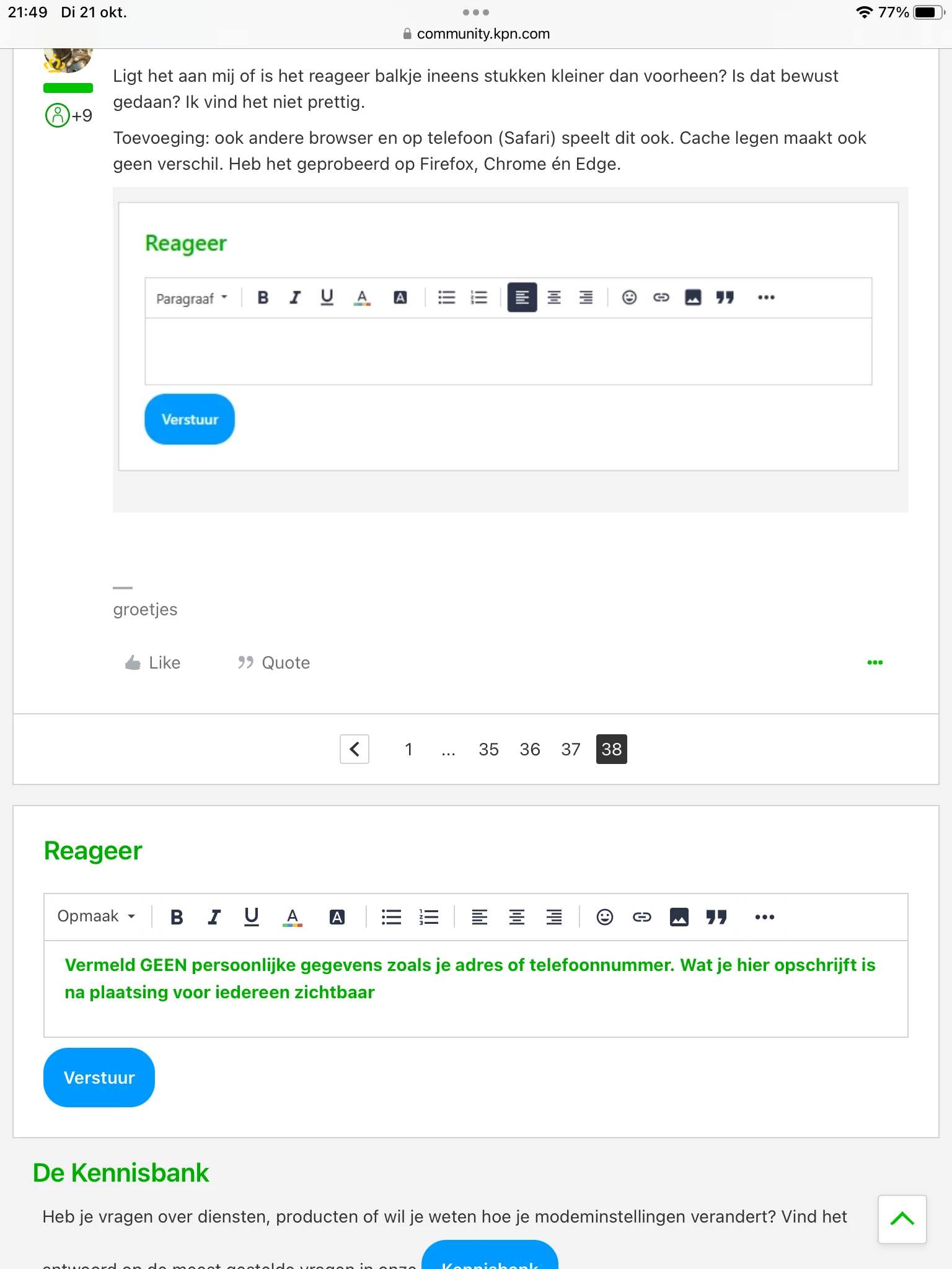 Ligt het aan mij of is het reageer balkje ineens stukken kleiner dan voorheen? Is dat bewust gedaan? Ik vind het niet prettig.