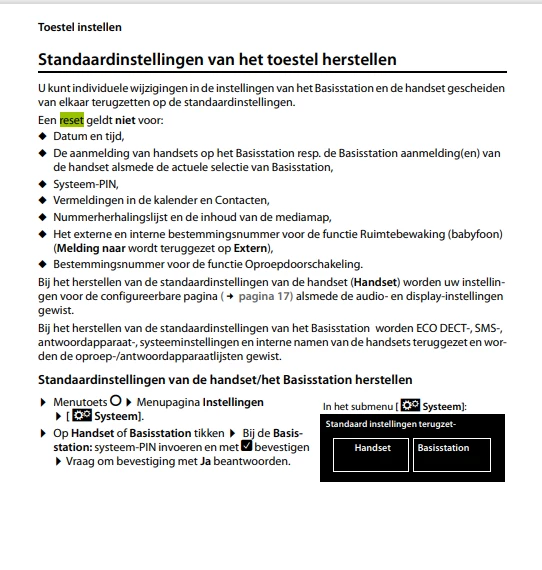 8 seconden lijkt mij ook iets aan de korte kant, helemaal met een rollator. Dank aan iedereen voor de al geboden hulp. Wat ik nog zie in de handleiding is de optie om het basisstation te resetten, lukt dit wel via het menu van de handset? Ik zie namelijk dat de instellingen van het antwoordapparaat dan ook worden gereset.