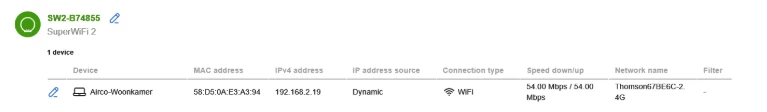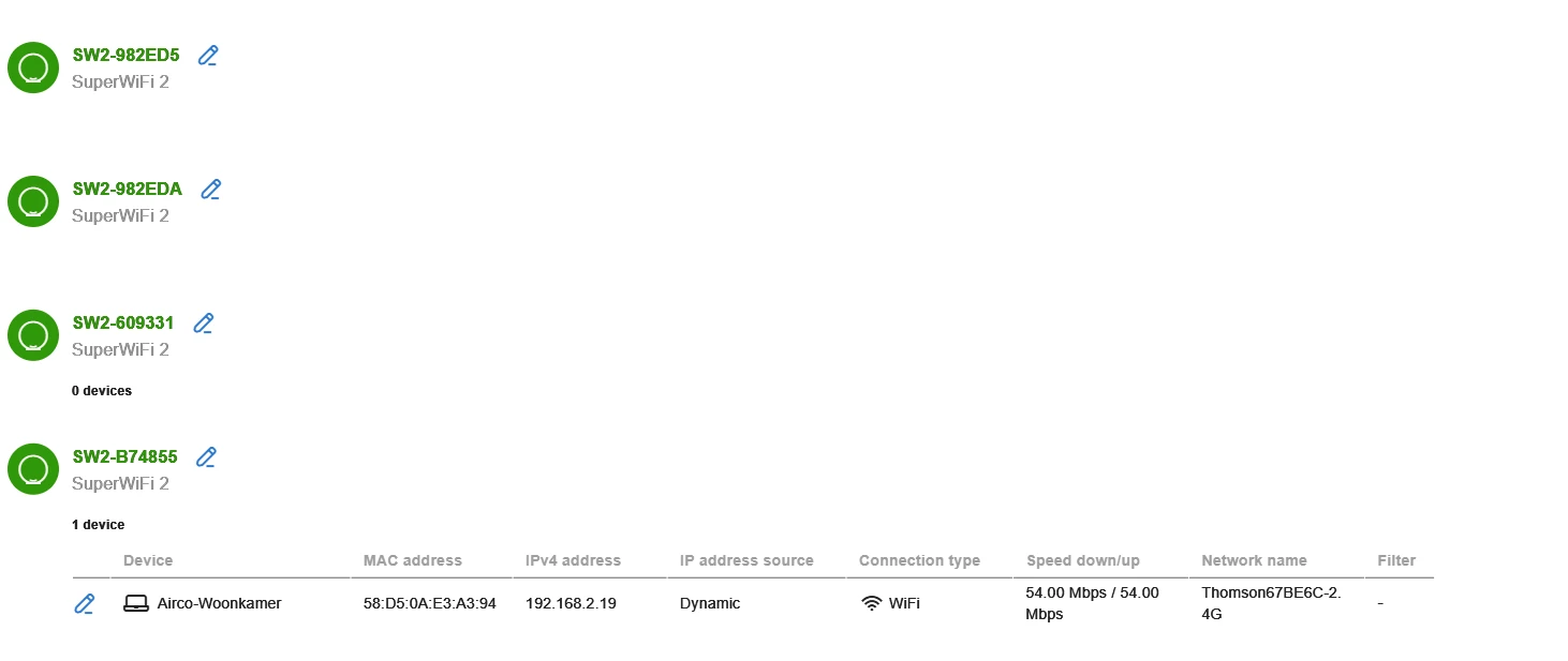 Aan 3 van de 4 SW2's is geen enkel device gekoppeld (zie screen-print hieronder) en bij het enige device gekoppeld aan een SW2 staat een SSID dat helemaal niet aktief is (en dus ook niet op de mobiel kan worden gekozen) en dat is al zo sinds enkele uren.. dus het is geen kwestie van een update vertraging, op reload drukken geeft geen ander resultaat.