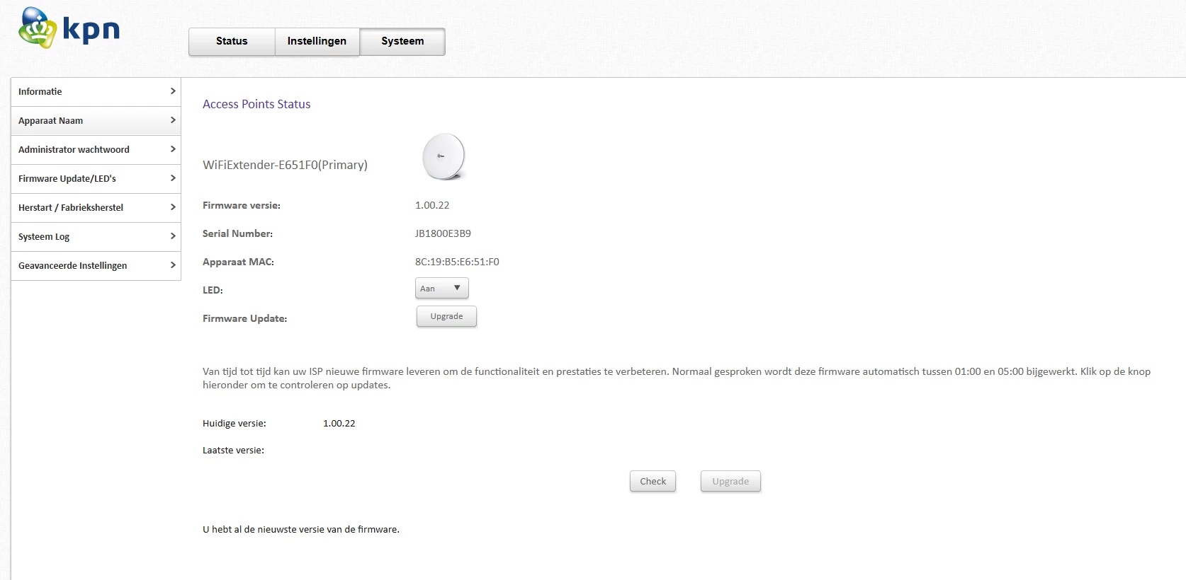 Afgelopen maandag heb ik een schone installatie uitgevoerd, zolas beschreven op de site. Helaas heeft dit geen verandering gebracht, in eerste instantie wilde het nog wel functionerende WiFi punt ook niet meet koppelen, maar dat is opgelost. De andere 2 blijven onveranderd als WiFi extender aangegeven en niet als super WiFi. Ik heb via het ip-adres ingelogd en zie daar dat de firmware op 1.00.00 staat en deze kan niet geüpdatet worden. Ik heb mijn modem beneden staan en het supervisie punt boven,maar de meeste apparaten op de bovenverdieping maken verbinding met het modem en niet met het WiFi punt.