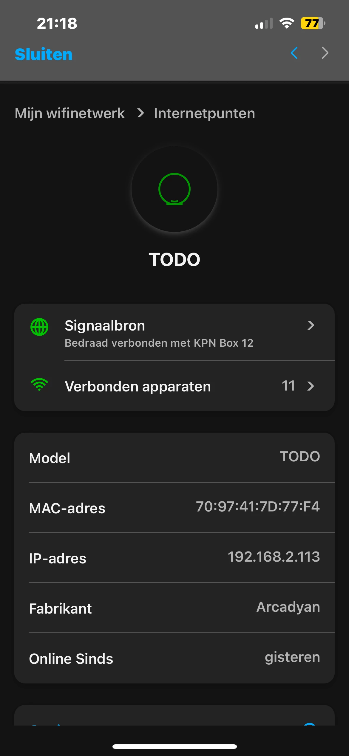 Bij de verbonden apparaten zie je de laatste SW punt als WifiExtender staan, terwijl dit precies dezelfde soort en type SW punt is als de drie anderen die wel als SW punt fungeren: