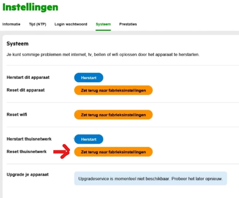 Het verschil met een reguliere reset van de modem is namelijk dat deze reset ook de wifi reset op onze servers en in de modem, dus ook de netwerknaam en wachtwoord gaat dan terug naar fabrieksinstellingen. Deze gegevens staan op de sticker van de modem zelf.