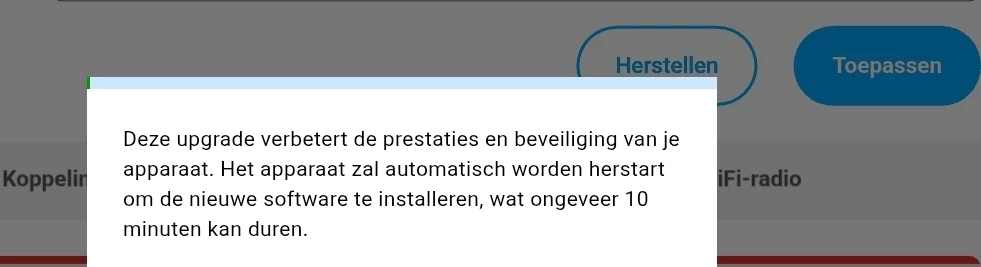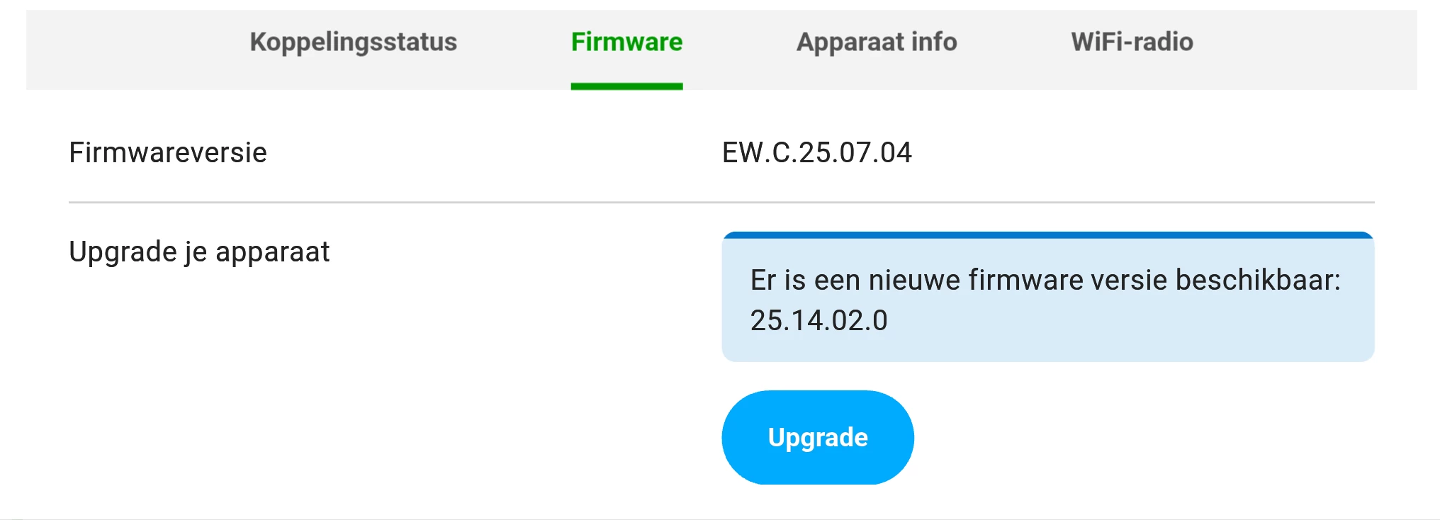 Kortom zojuist even gekeken en ik zag voor mij  EW ook de upgrade knop dus over een  minuut of tien moet het klaar zijn. Nu vraag ik mij wel af is het een upgrade of een update? De switch naar de KPN software was voor mij een  upgrade, dit zie ik als een update.