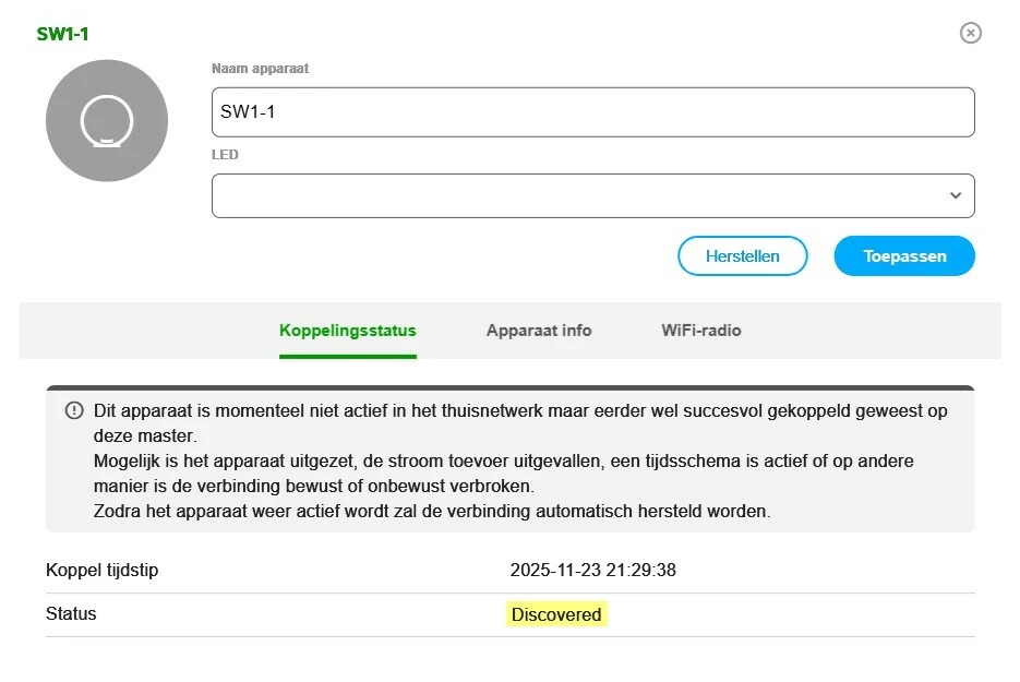 Bij de modem-instellingen wordt het oude SW-1 punt nog getoond, ook nadat het modem (KPN Box 12) ná ontkoppelen en verbreken van de bekabelde verbinding met het oude SW-1 punt herstart is. Het icoontje van het oude SW-1 punt is grijs, de status van et oude SW-1 punt is nu 'Discovered’.  Is er een manier om het oude SW-1 punt uit de lijst met verbonden apparaten te krijgen? Aangezien het apparaat niet langer met een kabel gekoppeld is, is knop ‘Ontkoppelen’ niet beschikbaar.