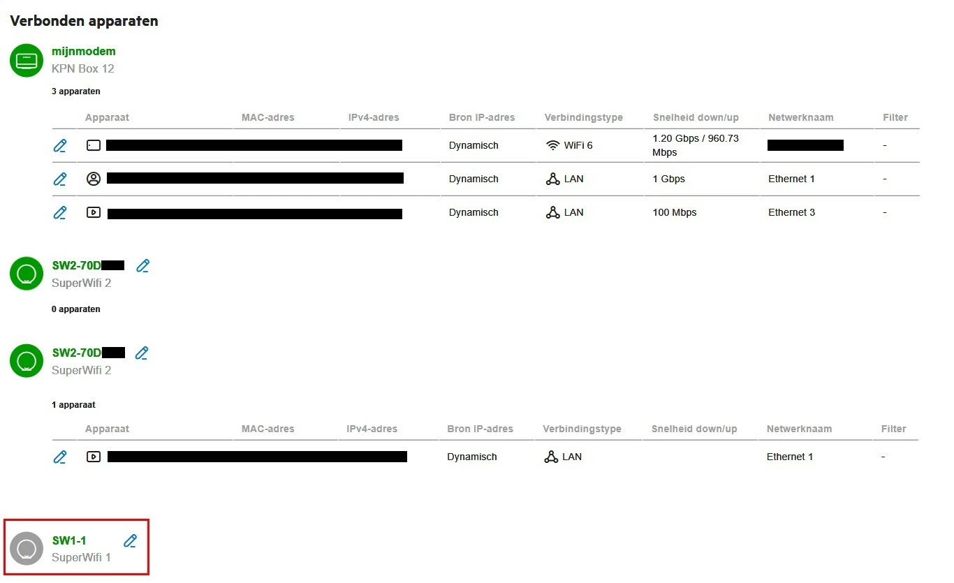 1. SW-1 opnieuw bekabeld gekoppeld aan de KPN Box 12, de status van de SW-1 werd daardoor 'Synced'
