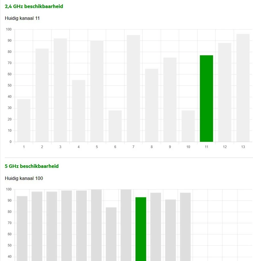 Beste ​@Edu2020 en ​@Cave Canem ik heb ook een V10 met KPN firmware en ik krijg het keurig te zien, 1 groene balk op kanaal 11 van de 2,4-band en 1 groene balk op kanaal 100 van de 5.0-band.