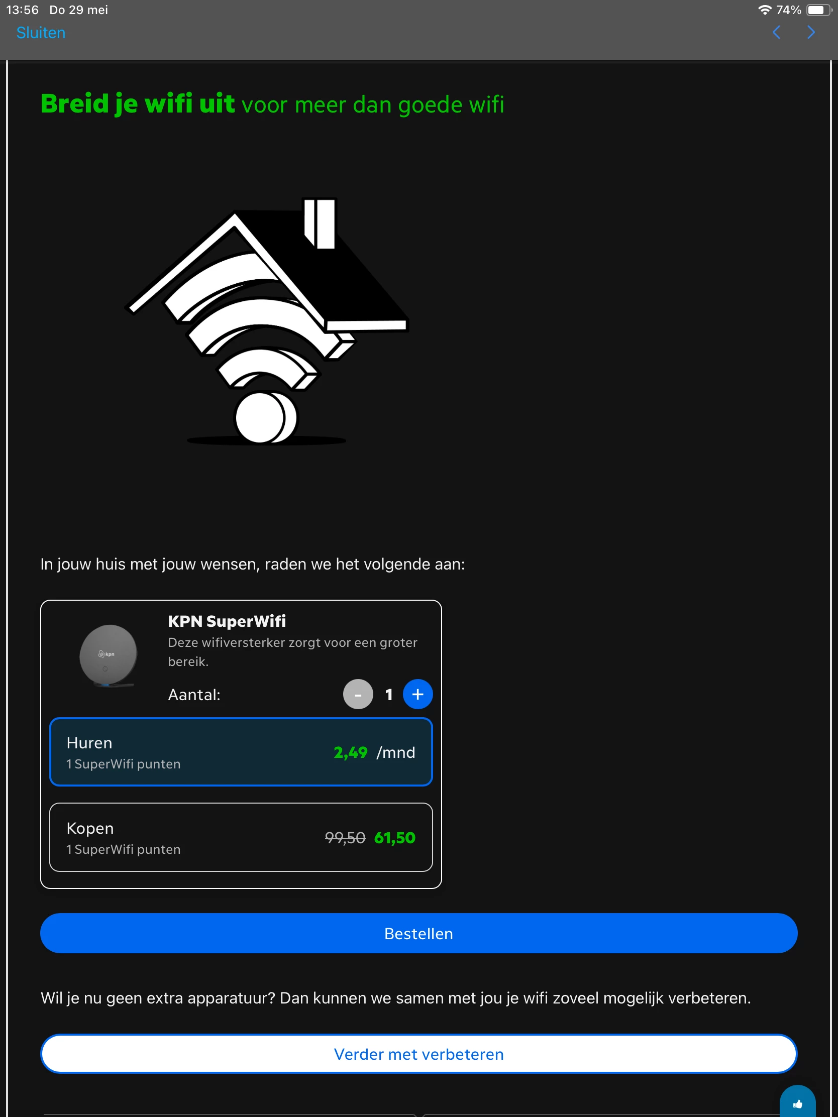 Er zijn feitelijk twee belangrijkere vragen, die eerst gesteld moet worden, waar is die wifi verbinding boven voor nodig? En wat mag het kosten? € 2,49 per maand per wifi punt of kopen € 199,00 voor 2 stuks. https://www.kpn.com/internet/wifi/superwifi