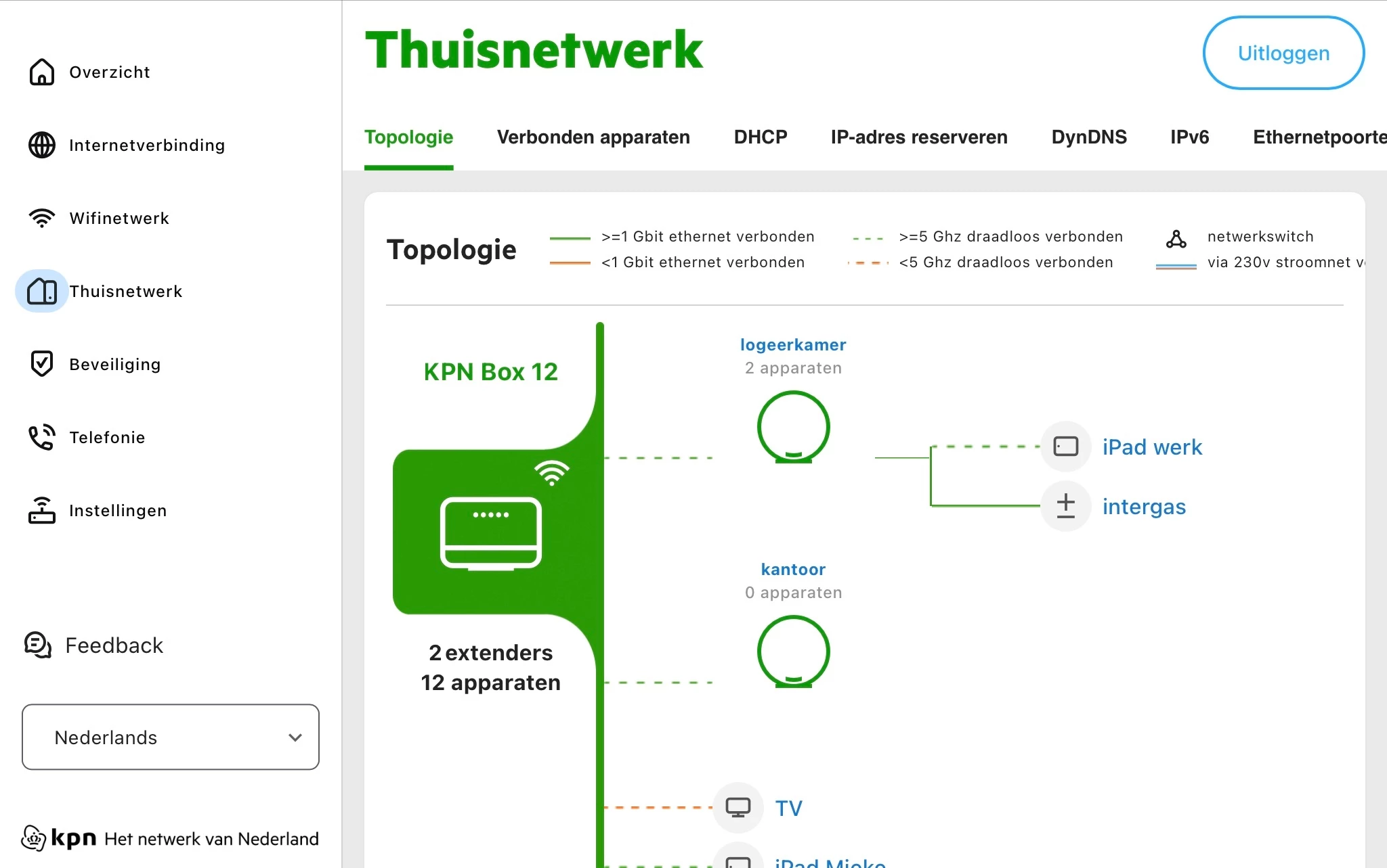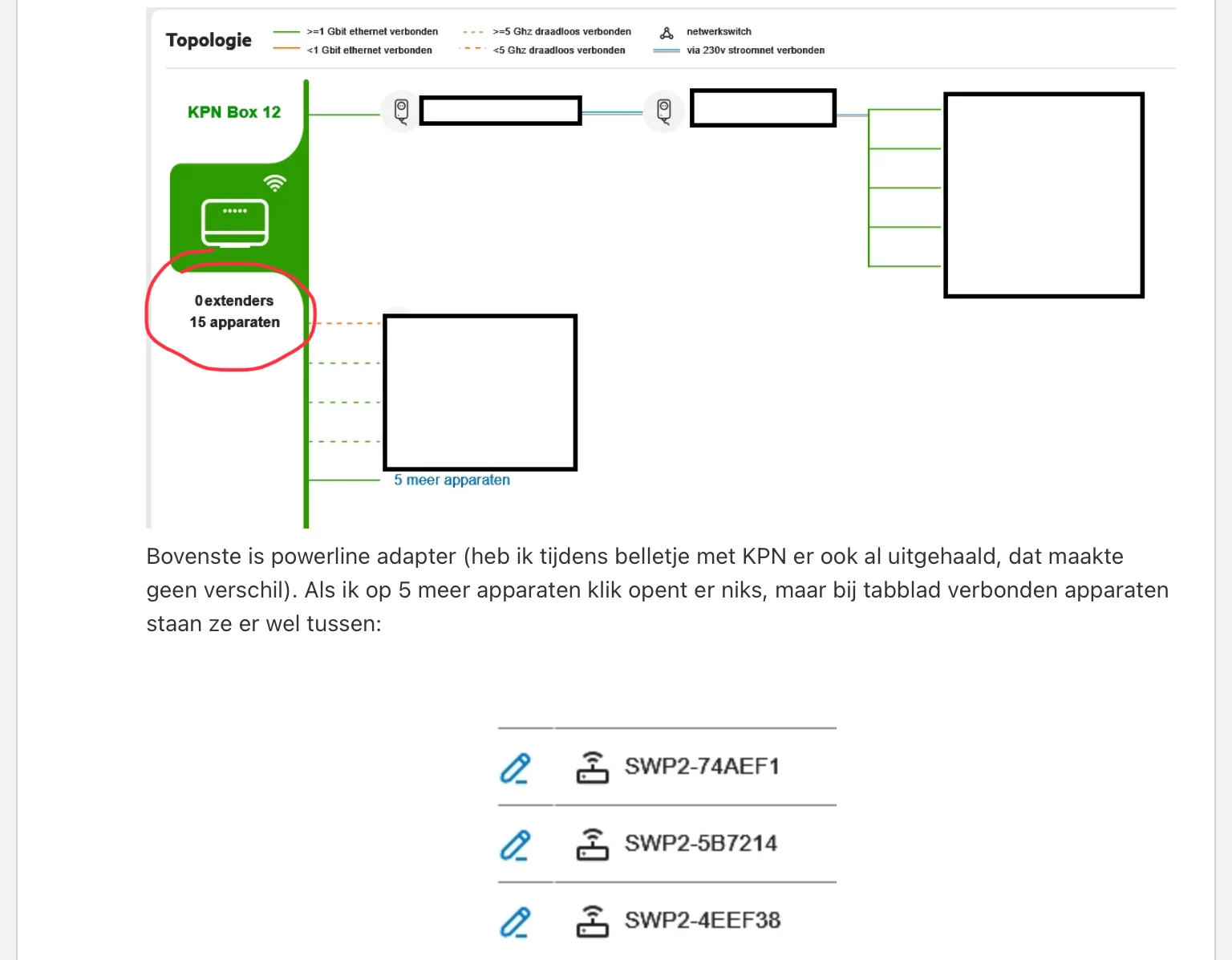 Bovenste is powerline adapter (heb ik tijdens belletje met KPN er ook al uitgehaald, dat maakte geen verschil). Als ik op 5 meer apparaten klik opent er niks, maar bij tabblad verbonden apparaten staan ze er wel tussen: