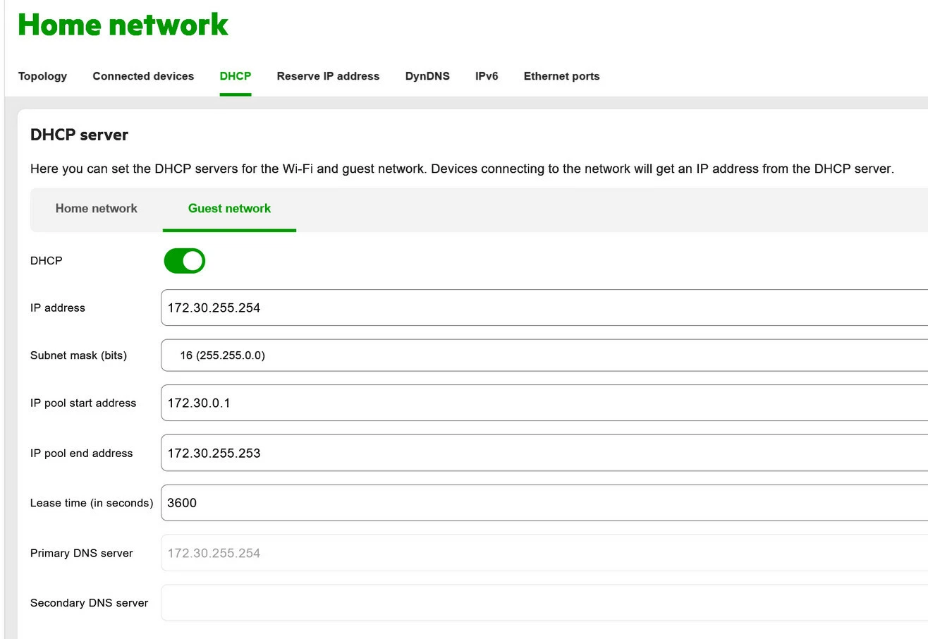 We hebben wel iets veranderd aan de IP-range van het gastennetwerk, maar van oorsprong zat die wel in de range 170.30.#.#. Thuis heb ik ook een Experiabox V10 en daar heeft het gastennetwerk een IP-range 170.30.0.1 - 172.30.255.253. Dat zal bij de vereniging ook zo zijn geweest, met hetzelfde probleem. Overigens heb ik thuis de wifi van de Experiabox geheel uitgeschakeld. Thuis is op de Experiabox een Netgear router aangesloten waarvan ik de wifi gebruik. Bij deze router hebben alle apparaten die zijn aangesloten (bekabeld, wifi dan wel gastennetwerk) een IP-adres in de range van 192.168.1.1 -192.168.1.254. Die range van 170.30.#.# van het gastennetwerk van de Experiabox kwam me dan ook vreemd over.