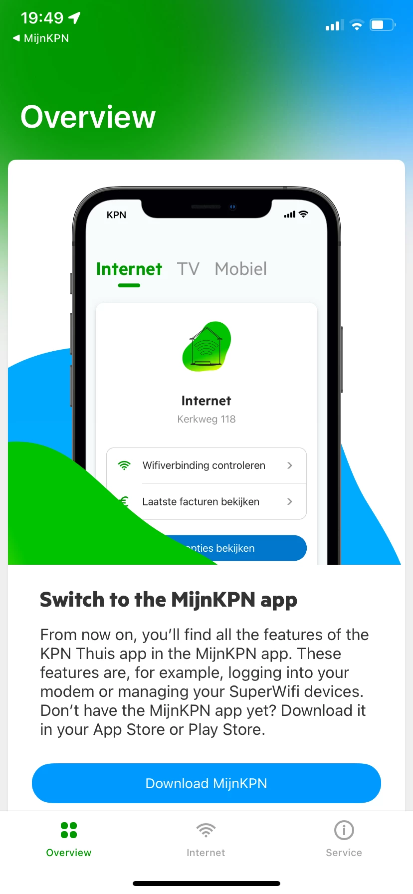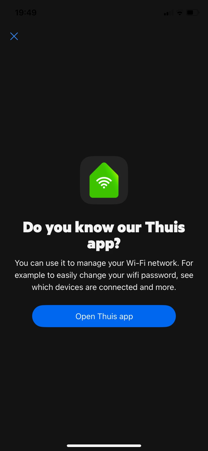 Ik open de MijnKPN-app > klik op “mijn netwerk” > krijg ik: “Ken je onze Thuis app?”