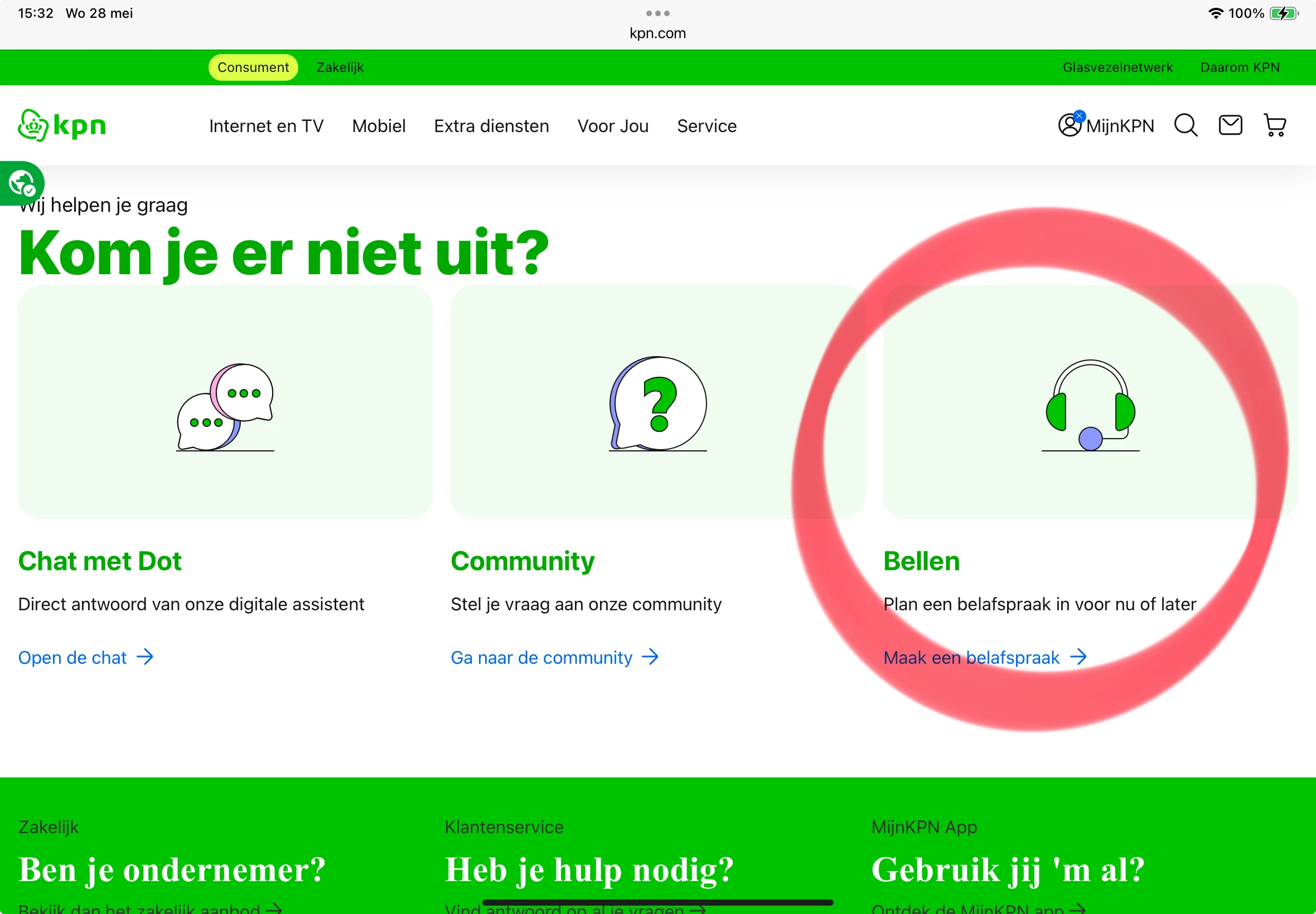 Met de link die je stuurt om een belafspraak te maken, kom ik in een uitgebreid menu met allerlei ‘zelf hulp acties’. Ik zie nergens de mogelijkheid van een terugbelverzoek. We willen graag contact met iemand zodat het (eindelijk) opgelost wordt.