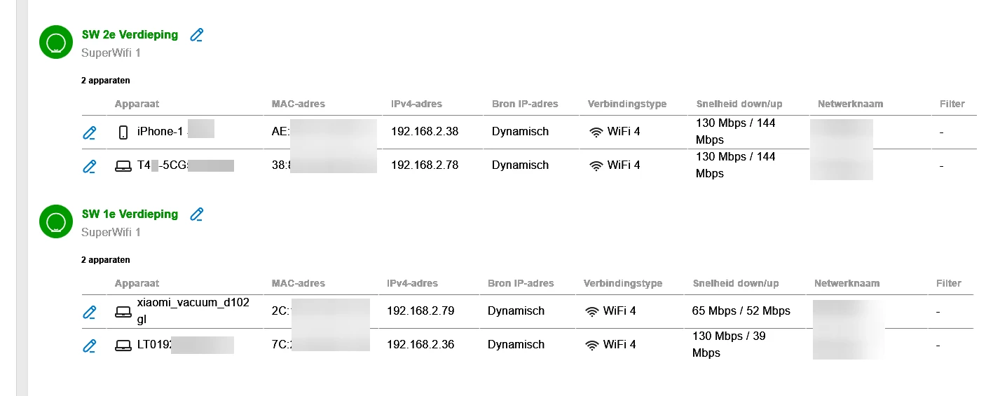 Eigenlijk sinds ik ben ingetrokken ervaar ik problemen met mijn (superwifi) wifi. Ik beschik over 2 SuperWifi V1 punten. Deze zijn direct op het modem bekabeld op de 1e en 2e verdieping. Geen enkel device maakt verbinding met 5ghz op de superwifi punten. Dat resulteert in zeer trage (onstabiele) verbindingen. Daarnaast maken devices ook hele vreemde keuzes met welk AP ze verbinding maken. Zo staat het LT019xx device en de Xiaomi stofzuiger praktisch naast het AP op de 2e verdieping maar kiest er voor om verbinding te maken met het AP op 1e verdieping. Alle laptops/telefoons die ik in mijn bezit heb beschikken over minimaal wifi 6.
