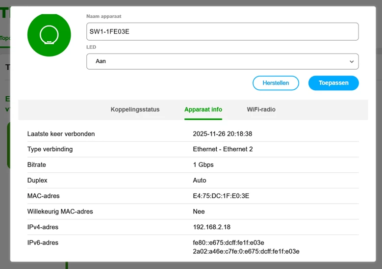 Daarna SW1 bekabeld aangesloten. Lampje SW1 wordt groen, is verbonden en te zien in de topologie van de modem als synced en heeft ook de laatste software update.