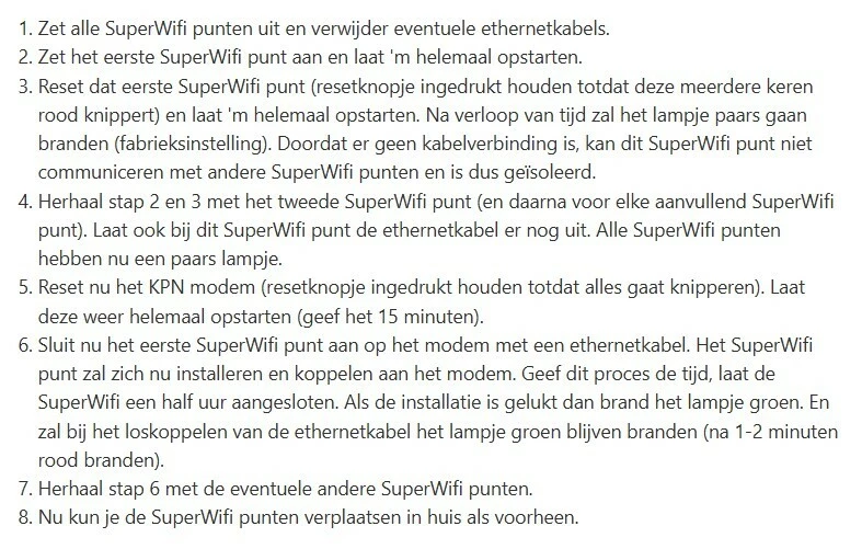 In de meeste gevallen lost een schone installatie van de SuperWifi punten dit op, zoals StephanP ook al benoemde. Dat heeft even wat voeten in de aarde, maar daarna begin je met een schone lei en zien we dat in de meeste gevallen de SuperWifi punten weer lief meewerken.