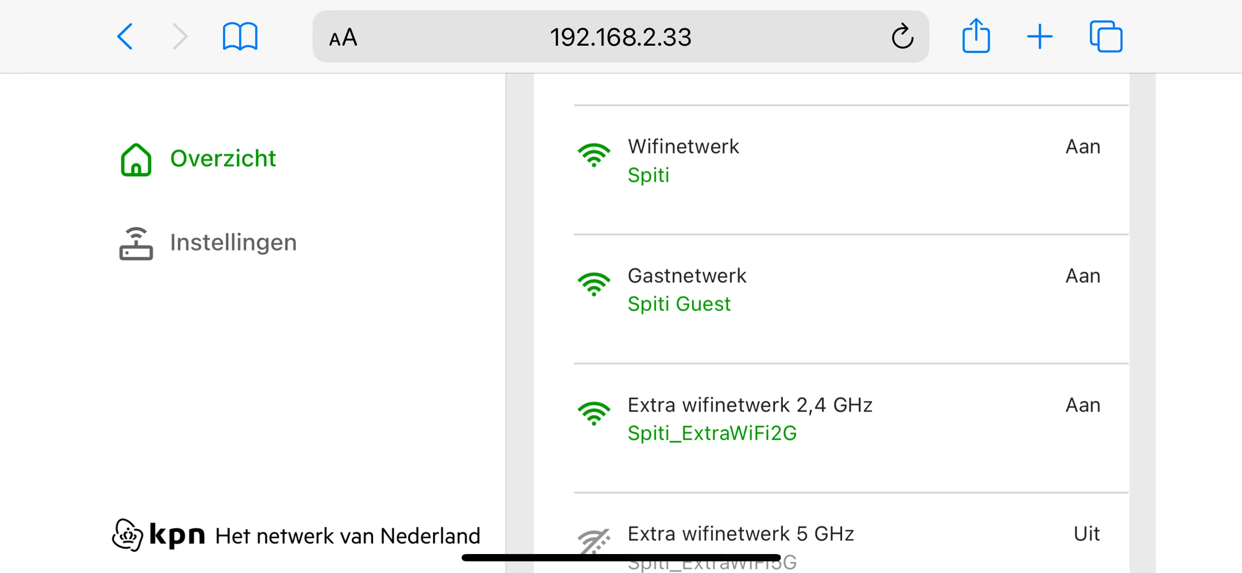 Eenmaal ingelogd op een SuperWifi 2 met KPN Software krijg je een overzichtspagina te zien. Belangrijkste hierop zijn de wifigegevens en verbonden apparaten. Hoewel dit laatste nog niet goed werkt. De Topologie weergave geeft apparaten die verbonden zijn met de SuperWifi 2 niet weer. Dit is alleen een weergavefout. De aangesloten apparaten functioneren technisch gezien volledig. Dit wordt in een latere update verholpen.